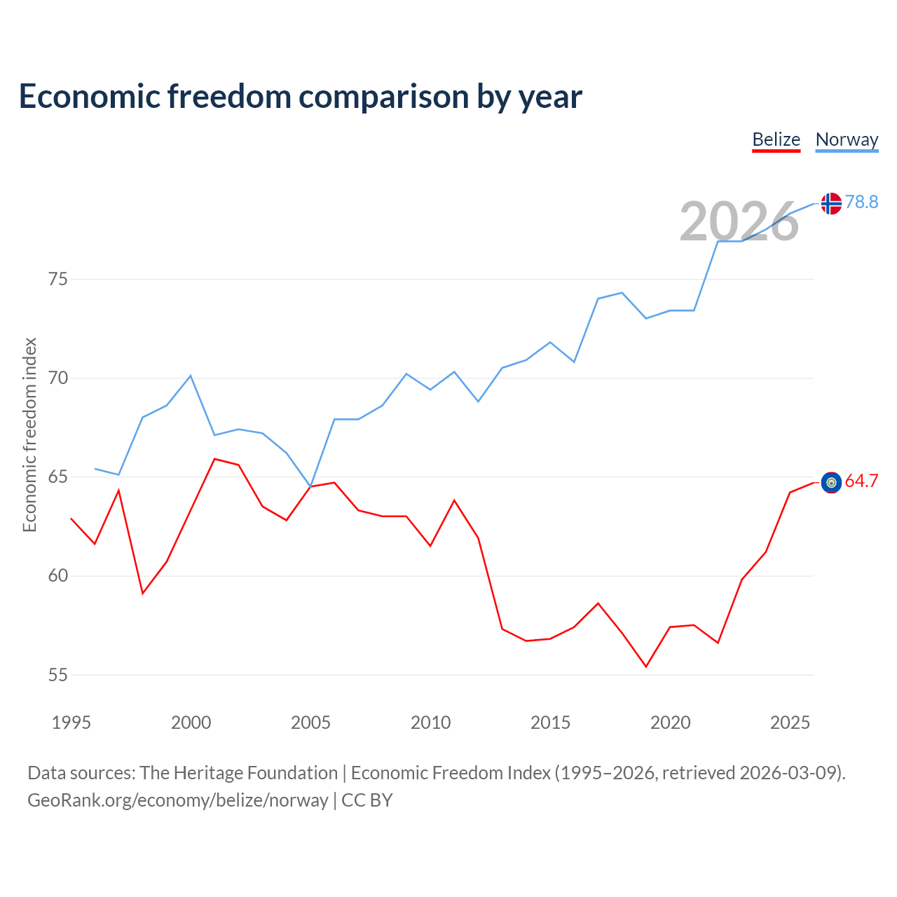 The Economic Freedom Index for Belize is 64.7, ranking 71/197, compared to 78.8 for Norway, ranking 9/197. The chart above displays a comparison of annual changes in economic freedom indexes.