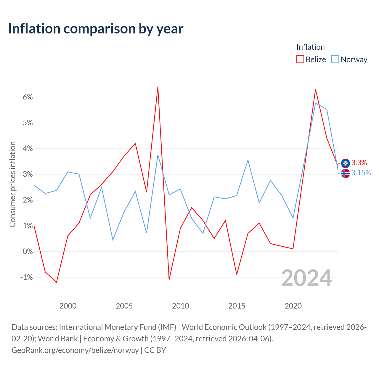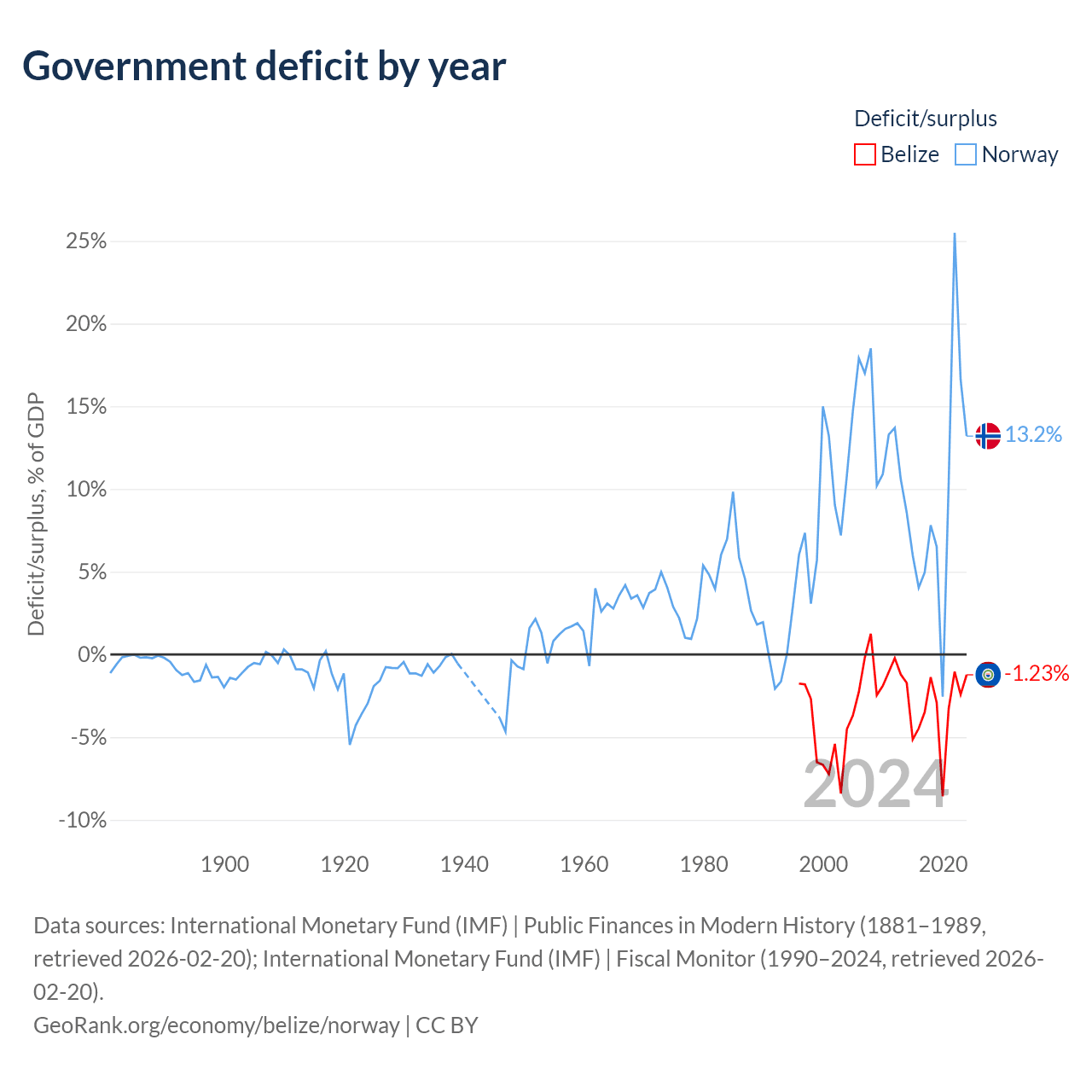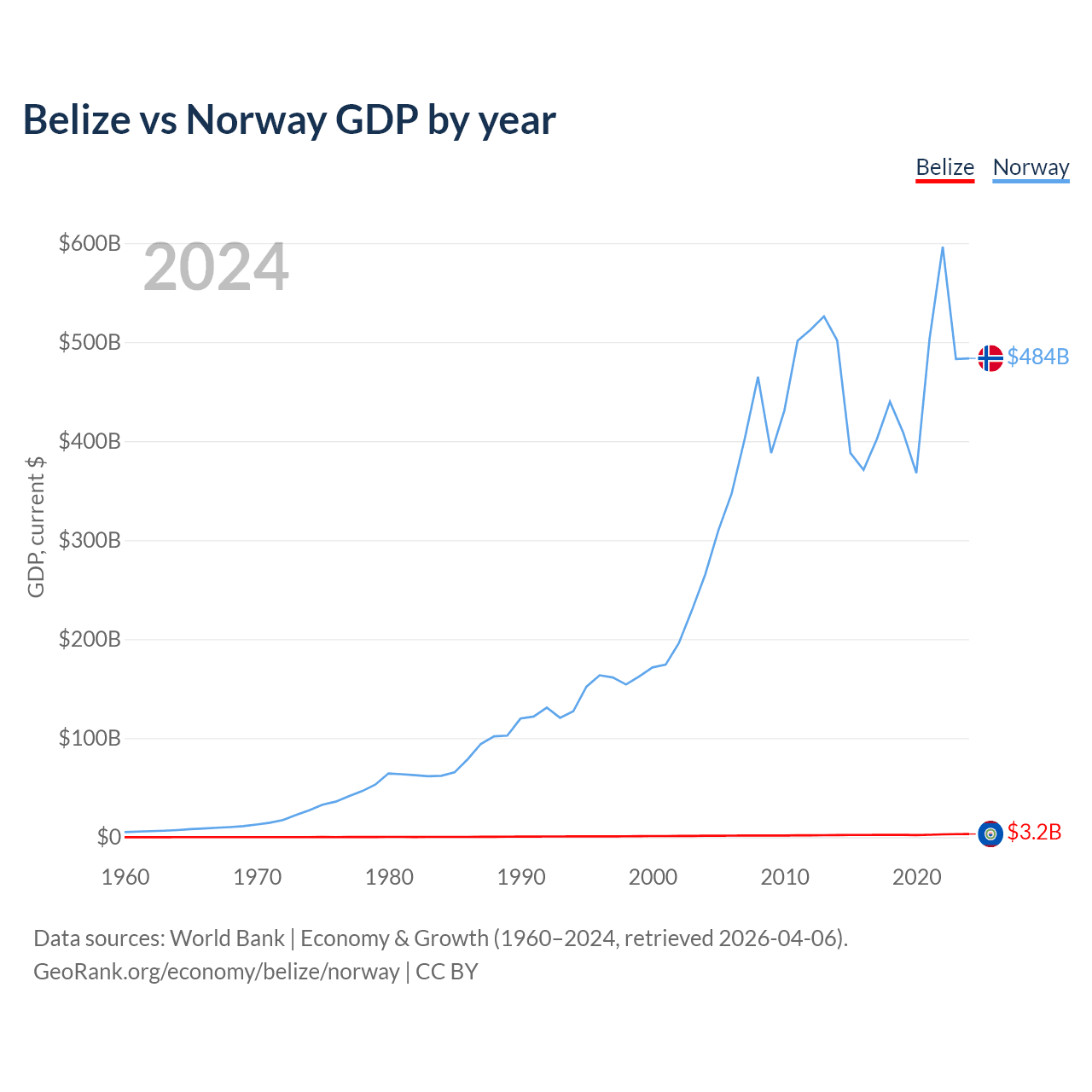 Belize has a GDP of $3.2B compared to $484B for Norway, ranking 168/197 and 32/197 by economy size, respectively.