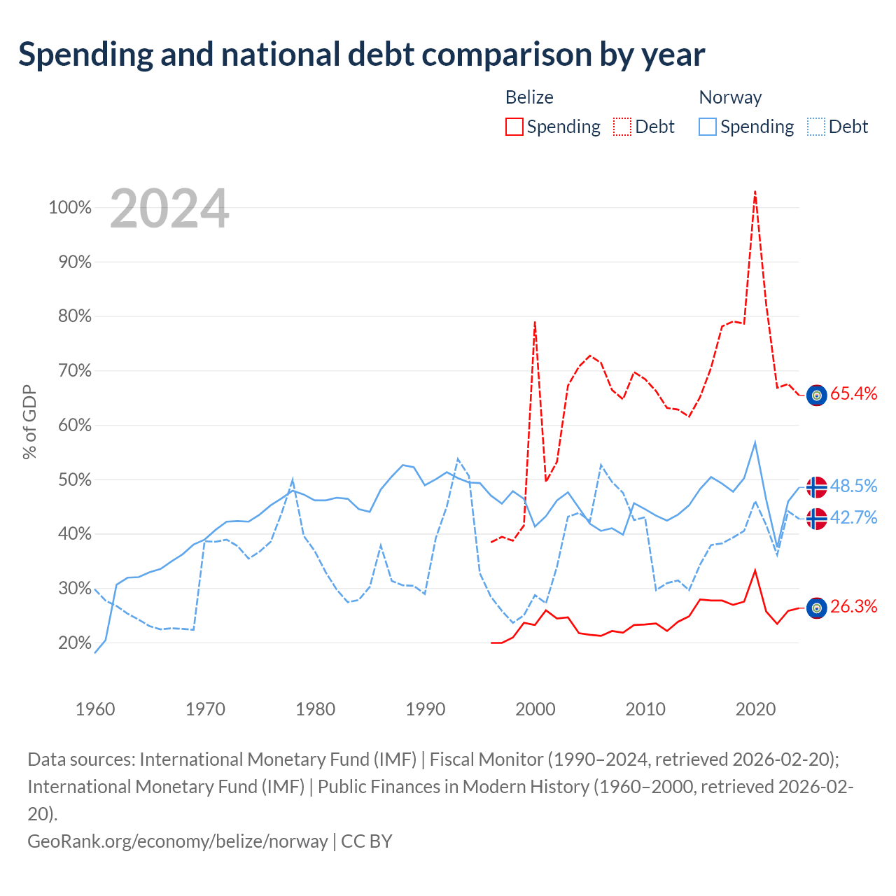Belize has $2.1B in government debt (65.4% of GDP), compared to $207B (42.7% of GDP) in Norway.
