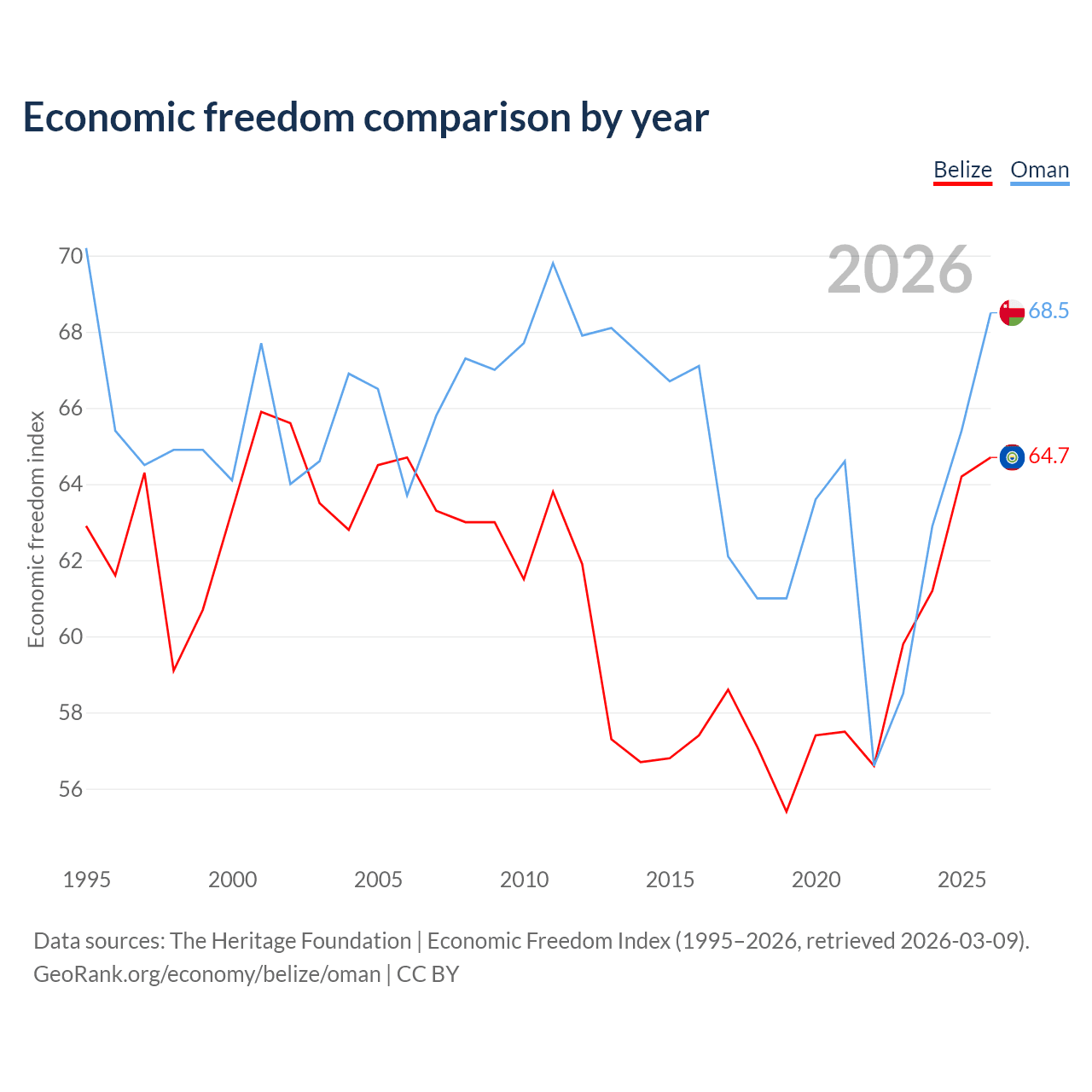 The Economic Freedom Index for Belize is 64.7, ranking 71/197, compared to 68.5 for Oman, ranking 45/197. The chart above displays a comparison of annual changes in economic freedom indexes.