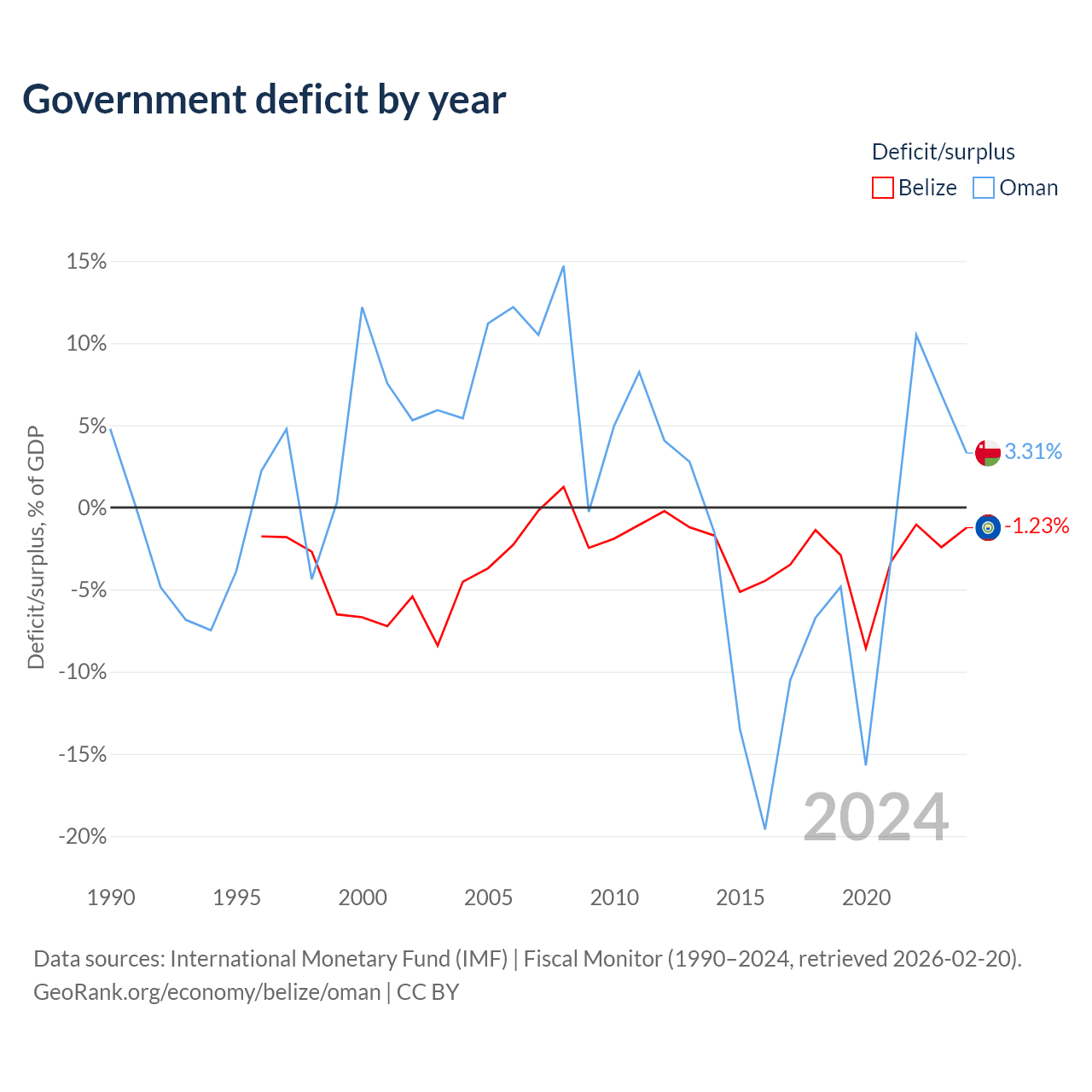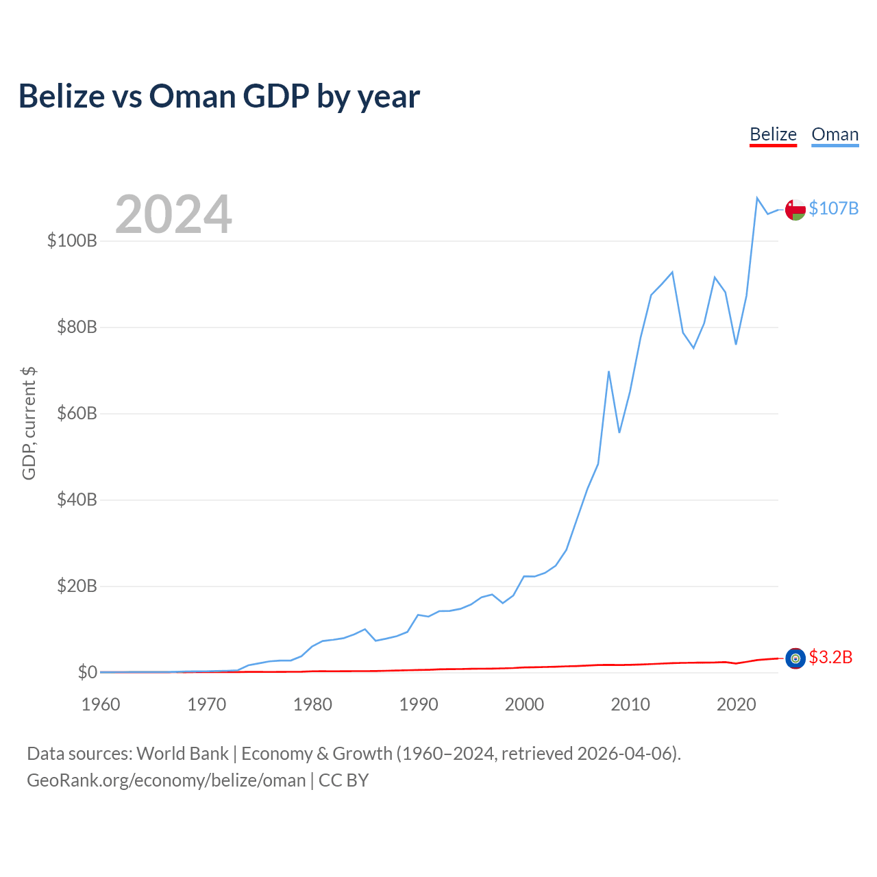 Belize has a GDP of $3.2B compared to $107B for Oman, ranking 168/197 and 70/197 by economy size, respectively.
