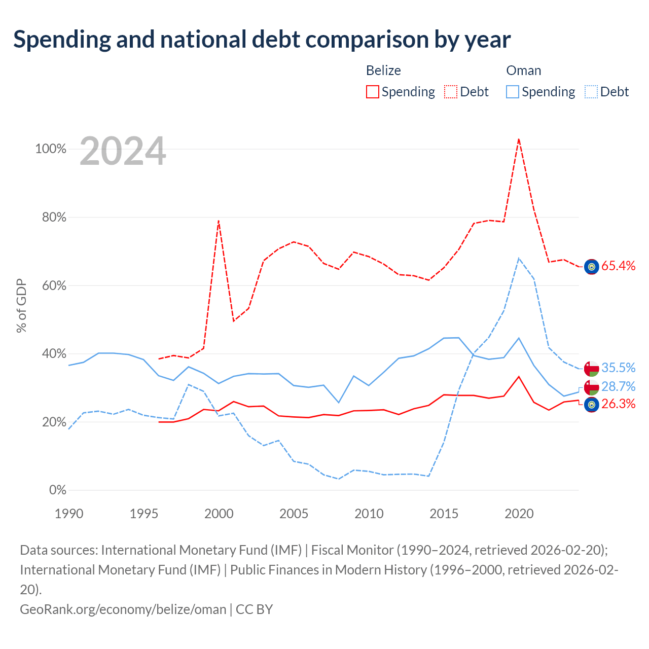 Belize has $2.1B in government debt (65.4% of GDP), compared to $38B (35.5% of GDP) in Oman.