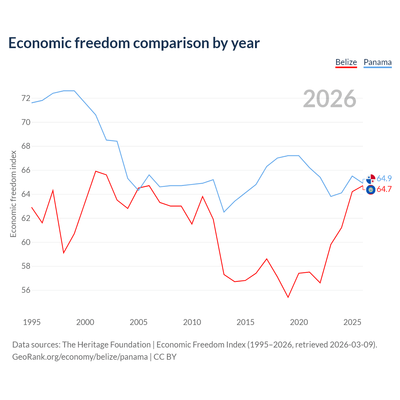 The Economic Freedom Index for Belize is 64.7, ranking 71/197, compared to 64.9 for Panama, ranking 70/197. The chart above displays a comparison of annual changes in economic freedom indexes.