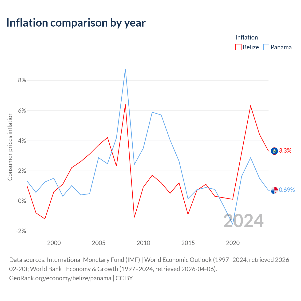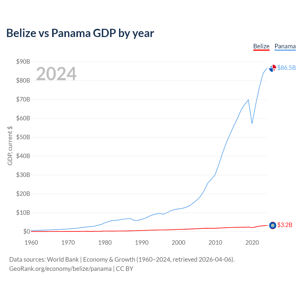 Belize has a GDP of $3.2B compared to $86.5B for Panama, ranking 168/197 and 78/197 by economy size, respectively.