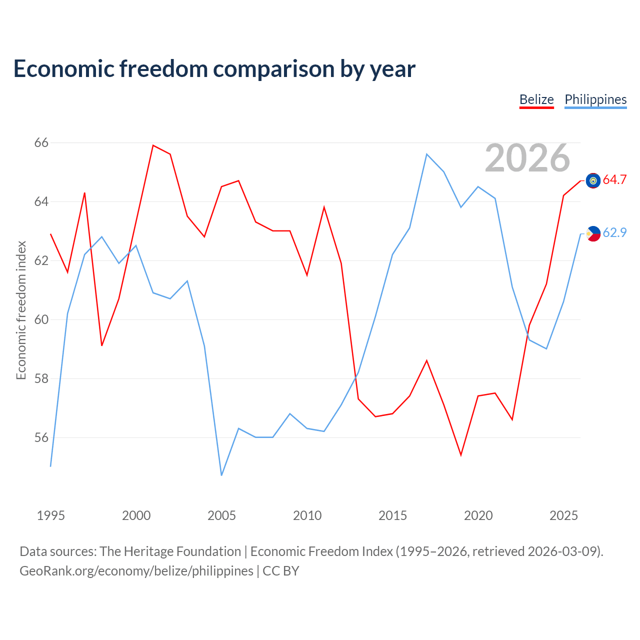 The Economic Freedom Index for Belize is 64.7, ranking 71/197, compared to 62.9 for the Philippines, ranking 85/197. The chart above displays a comparison of annual changes in economic freedom indexes.