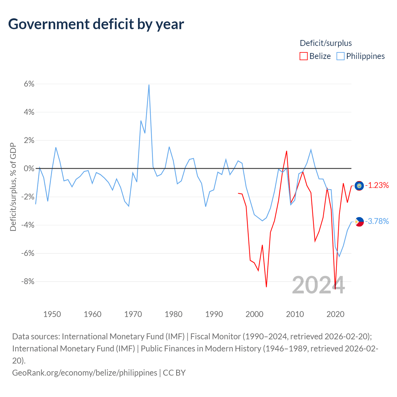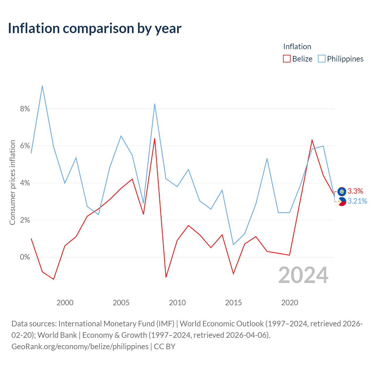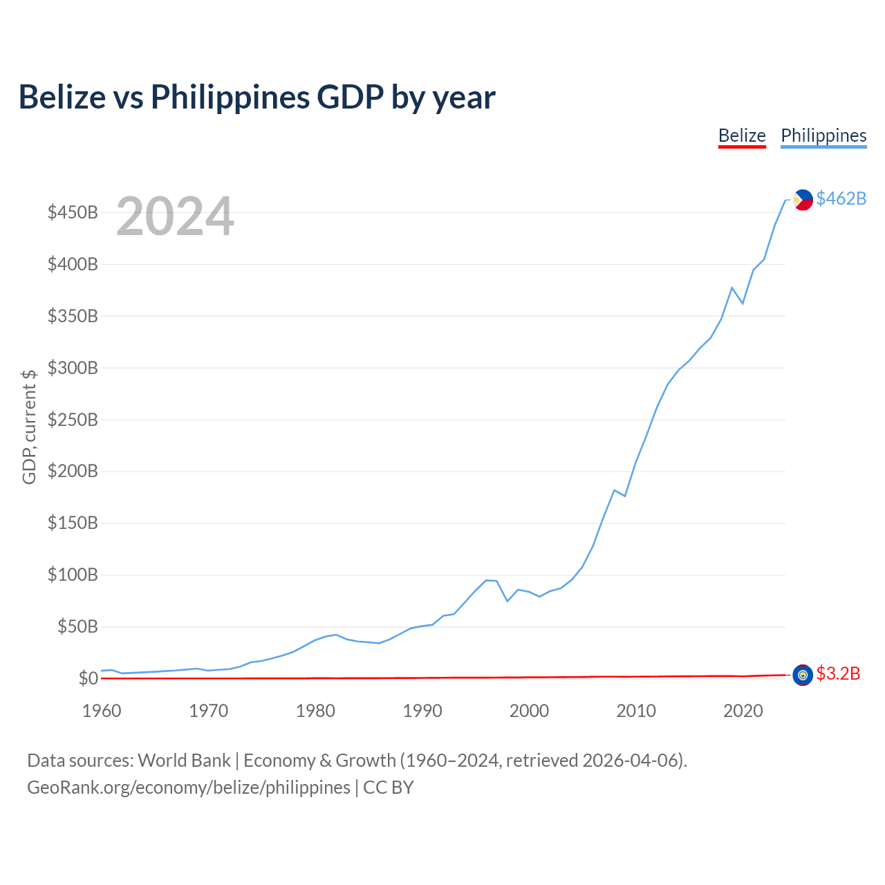 Belize has a GDP of $3.2B compared to $462B for the Philippines, ranking 168/197 and 35/197 by economy size, respectively.