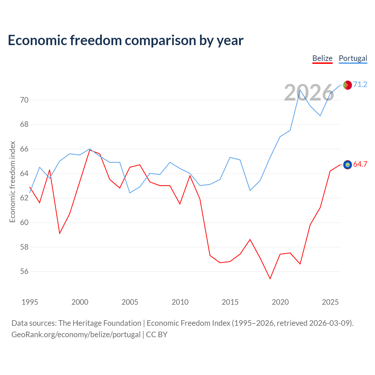 The Economic Freedom Index for Belize is 64.7, ranking 71/197, compared to 71.2 for Portugal, ranking 33/197. The chart above displays a comparison of annual changes in economic freedom indexes.