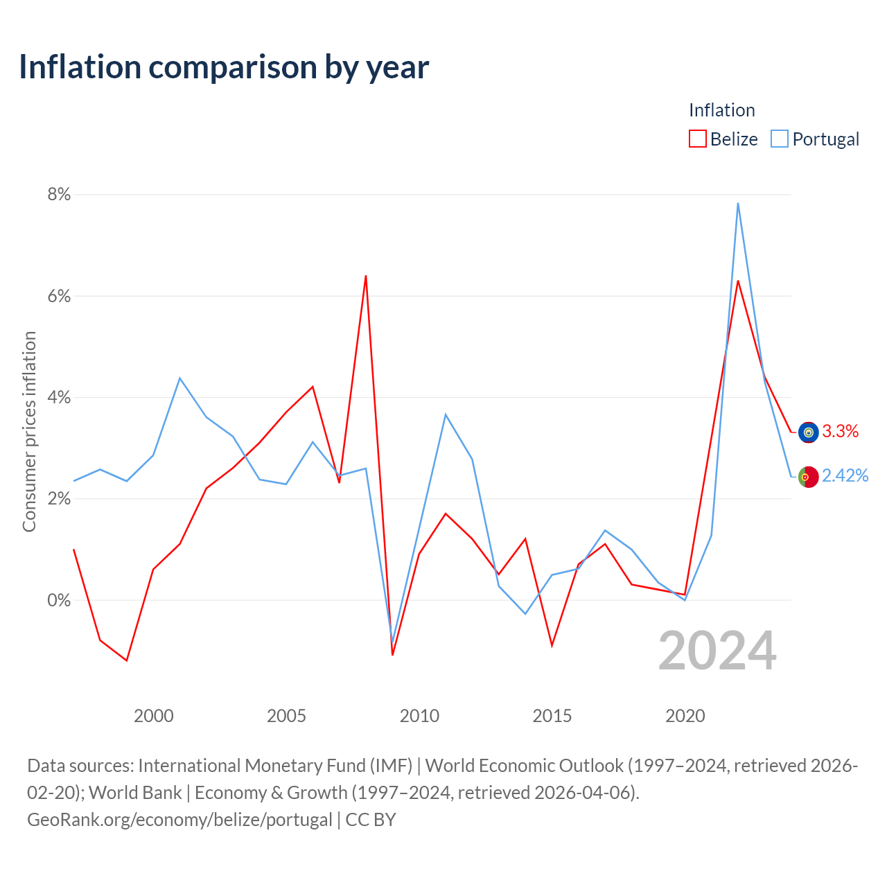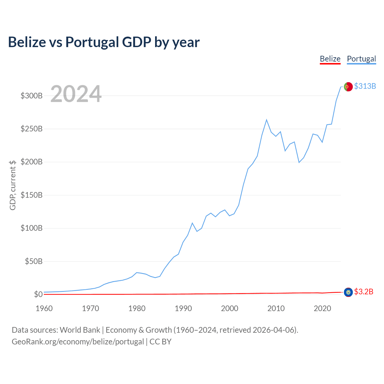 Belize has a GDP of $3.2B compared to $313B for Portugal, ranking 168/197 and 46/197 by economy size, respectively.