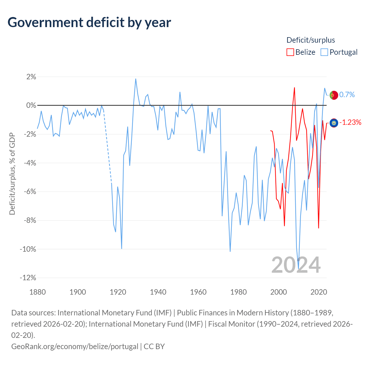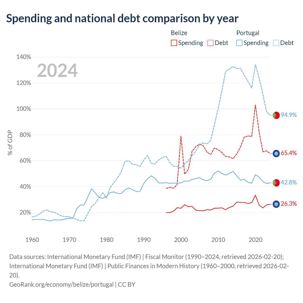 Belize has $2.1B in government debt (65.4% of GDP), compared to $297B (94.9% of GDP) in Portugal.