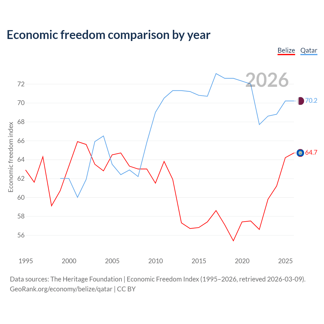 The Economic Freedom Index for Belize is 64.7, ranking 71/197, compared to 70.2 for Qatar, ranking 37/197. The chart above displays a comparison of annual changes in economic freedom indexes.