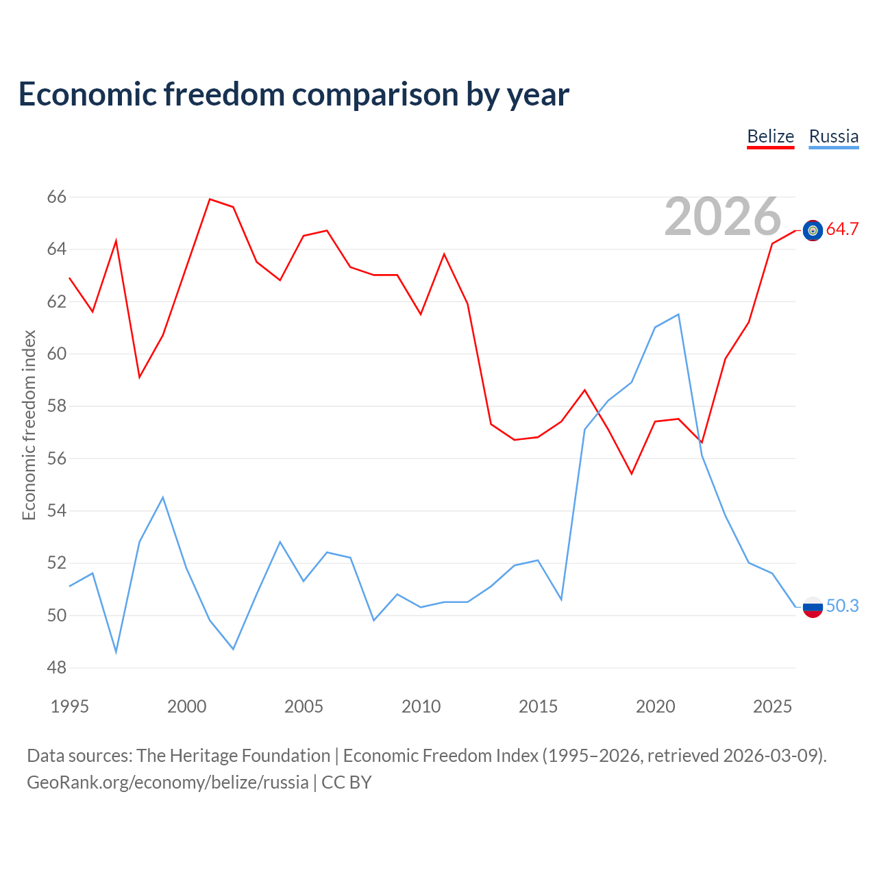The Economic Freedom Index for Belize is 64.7, ranking 71/197, compared to 50.3 for Russia, ranking 161/197. The chart above displays a comparison of annual changes in economic freedom indexes.