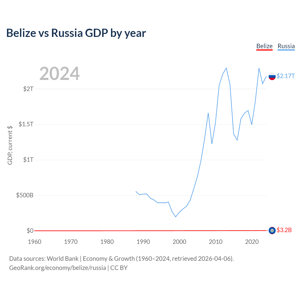 Belize has a GDP of $3.2B compared to $2.17T for Russia, ranking 168/197 and 11/197 by economy size, respectively.
