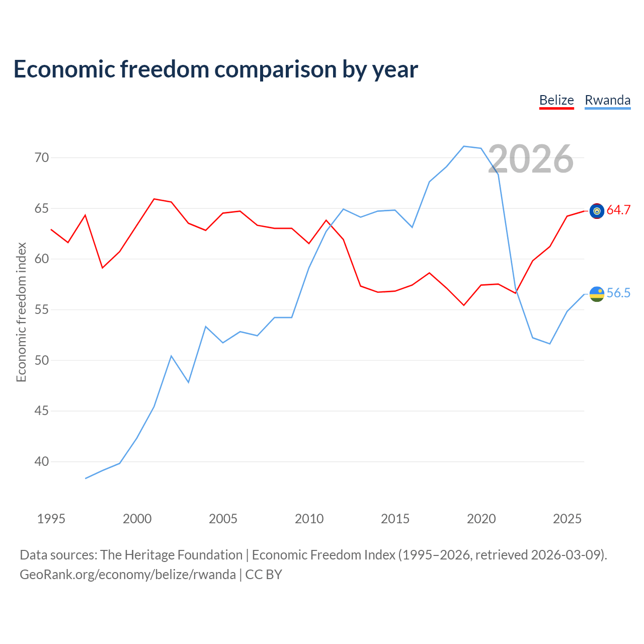 The Economic Freedom Index for Belize is 64.7, ranking 71/197, compared to 56.5 for Rwanda, ranking 121/197. The chart above displays a comparison of annual changes in economic freedom indexes.
