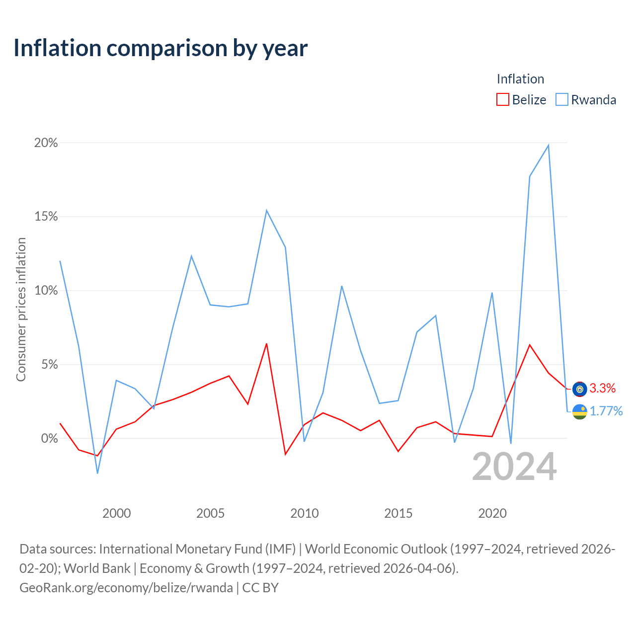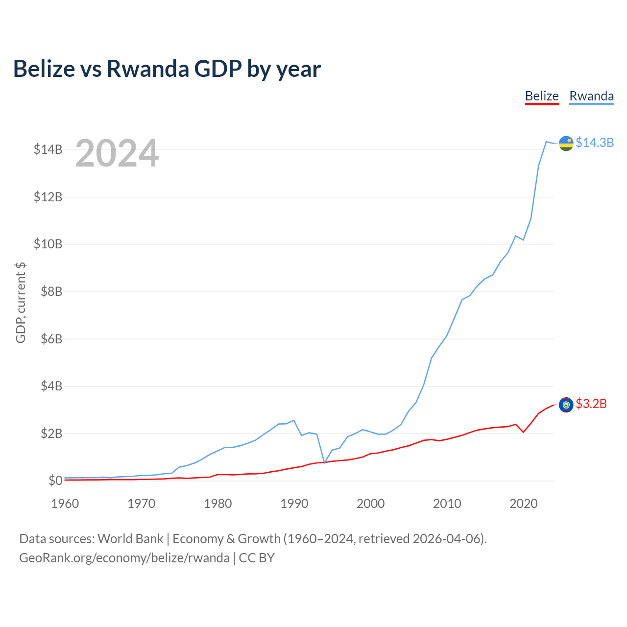 Belize has a GDP of $3.2B compared to $14.3B for Rwanda, ranking 168/197 and 144/197 by economy size, respectively.