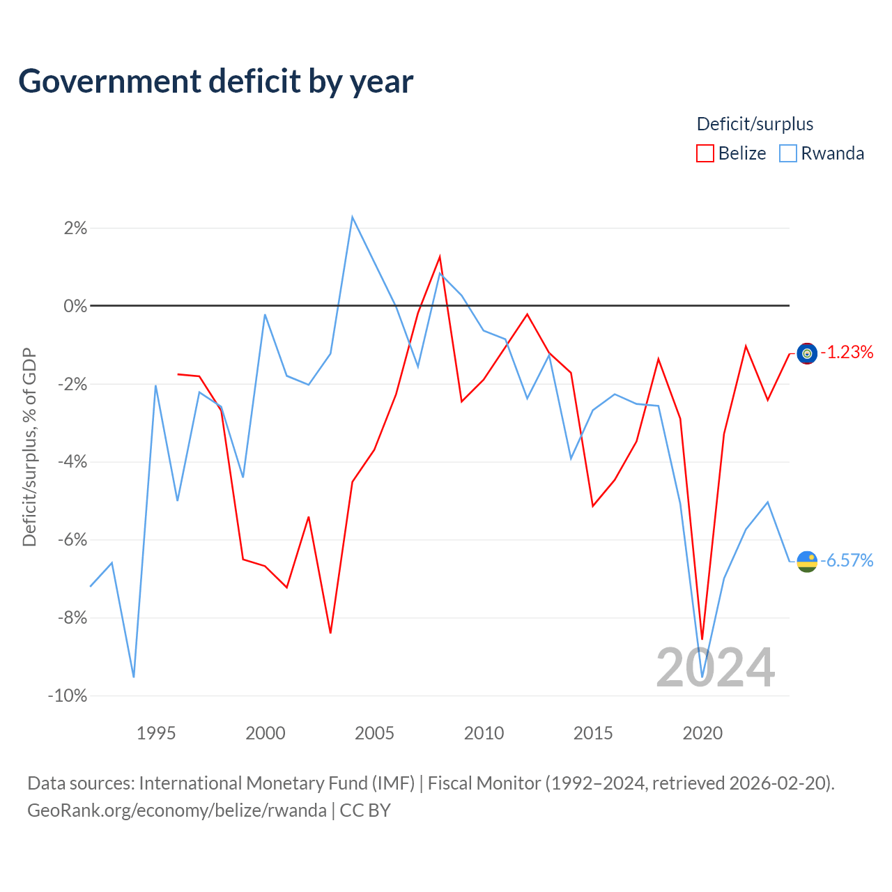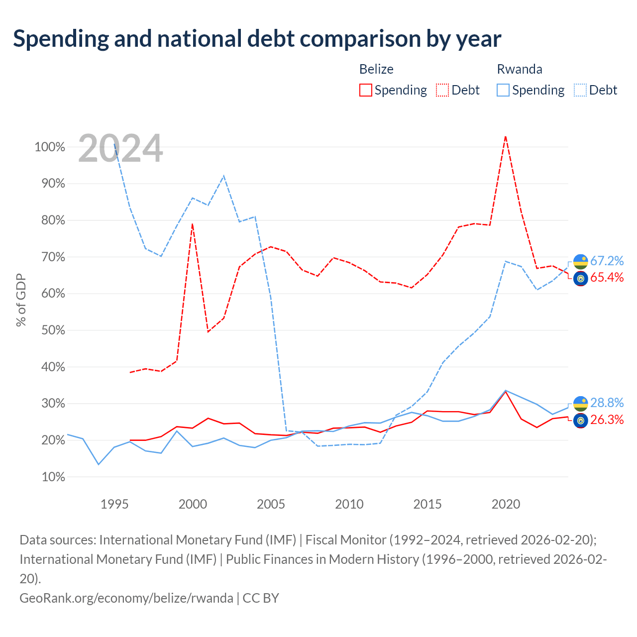 Belize has $2.1B in government debt (65.4% of GDP), compared to $9.58B (67.2% of GDP) in Rwanda.