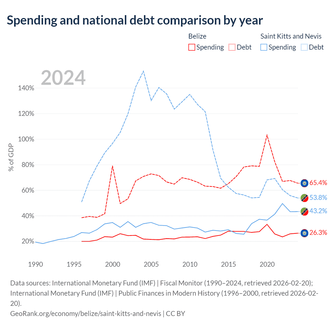 Belize has $2.1B in government debt (65.4% of GDP), compared to $604M (53.8% of GDP) in Saint Kitts and Nevis.
