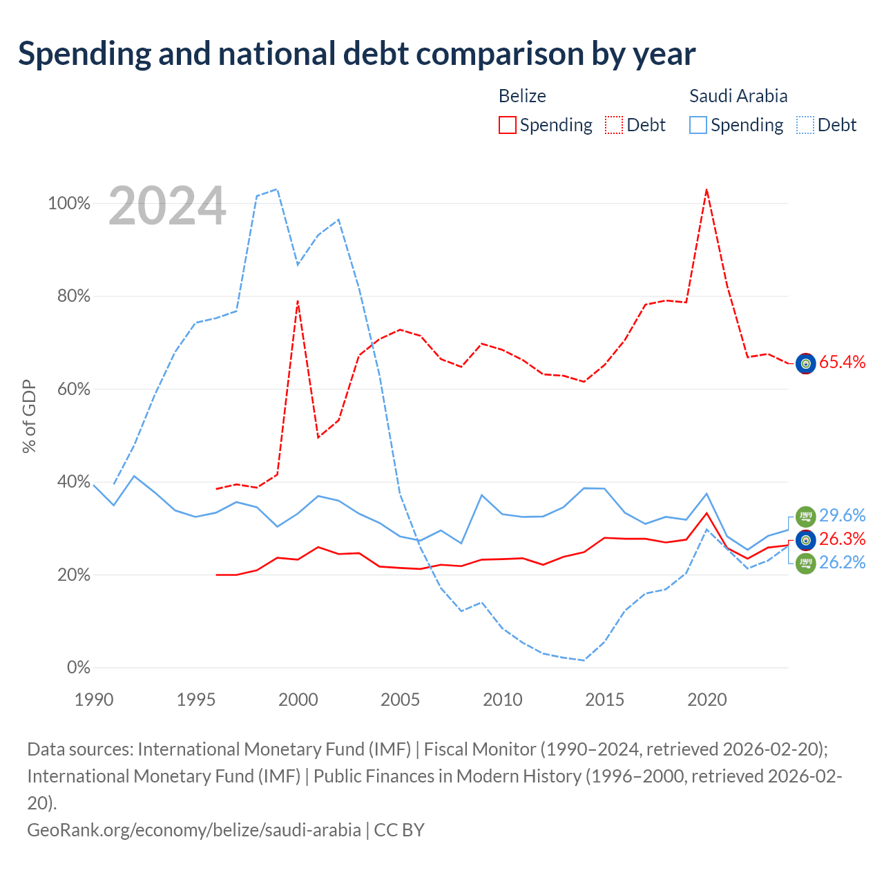 Belize has $2.1B in government debt (65.4% of GDP), compared to $324B (26.2% of GDP) in Saudi Arabia.