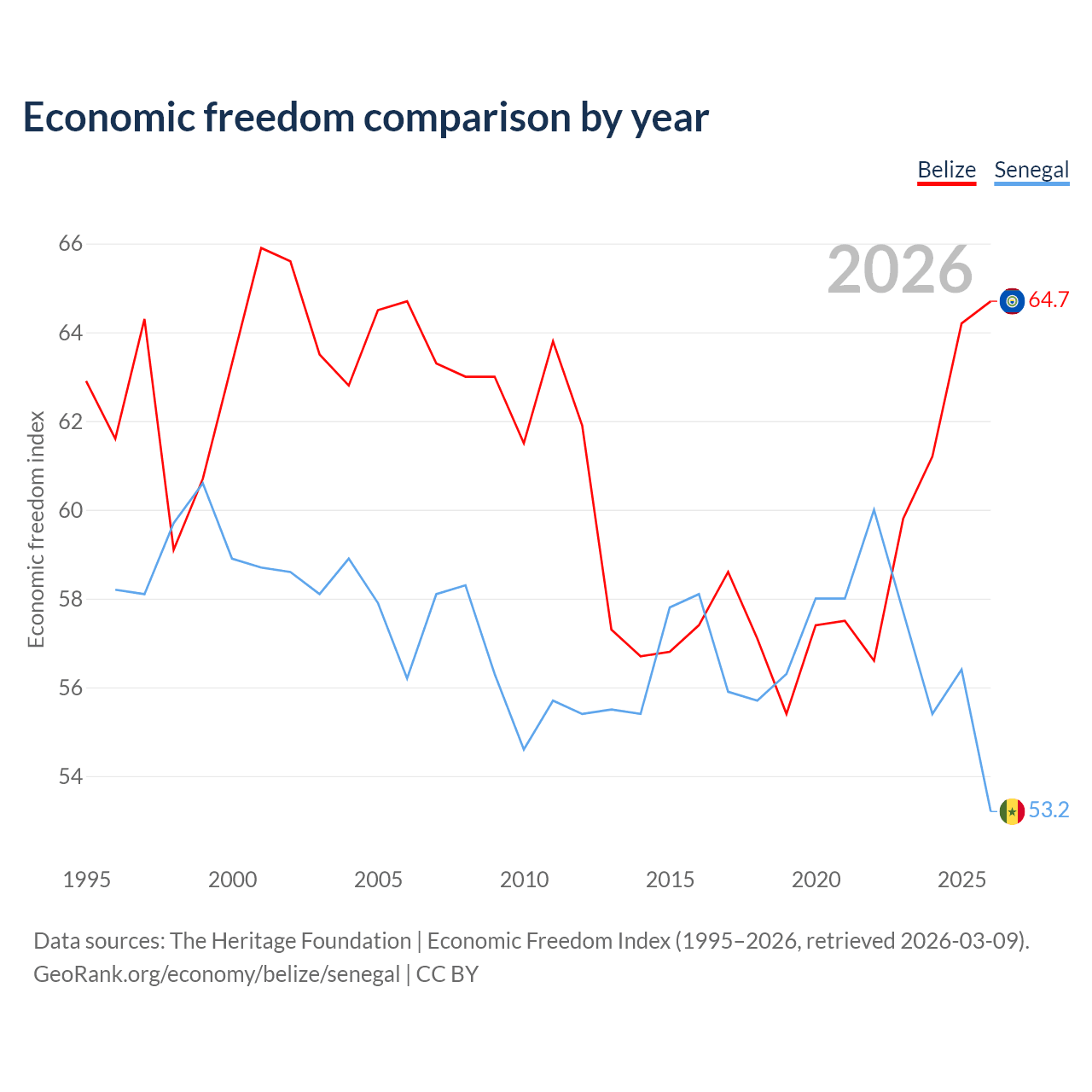 The Economic Freedom Index for Belize is 64.7, ranking 71/197, compared to 53.2 for Senegal, ranking 140/197. The chart above displays a comparison of annual changes in economic freedom indexes.