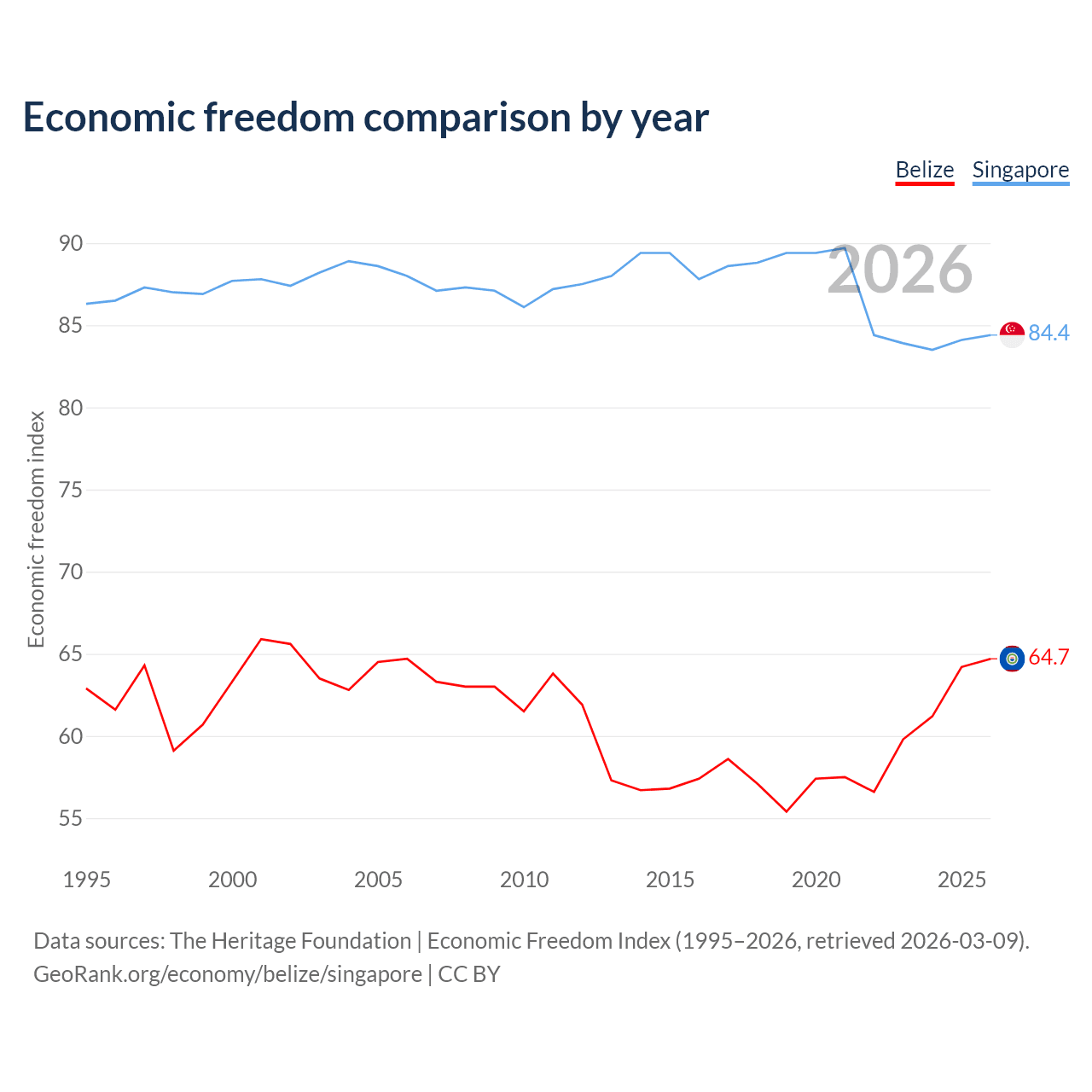 The Economic Freedom Index for Belize is 64.7, ranking 71/197, compared to 84.4 for Singapore, ranking 1/197. The chart above displays a comparison of annual changes in economic freedom indexes.