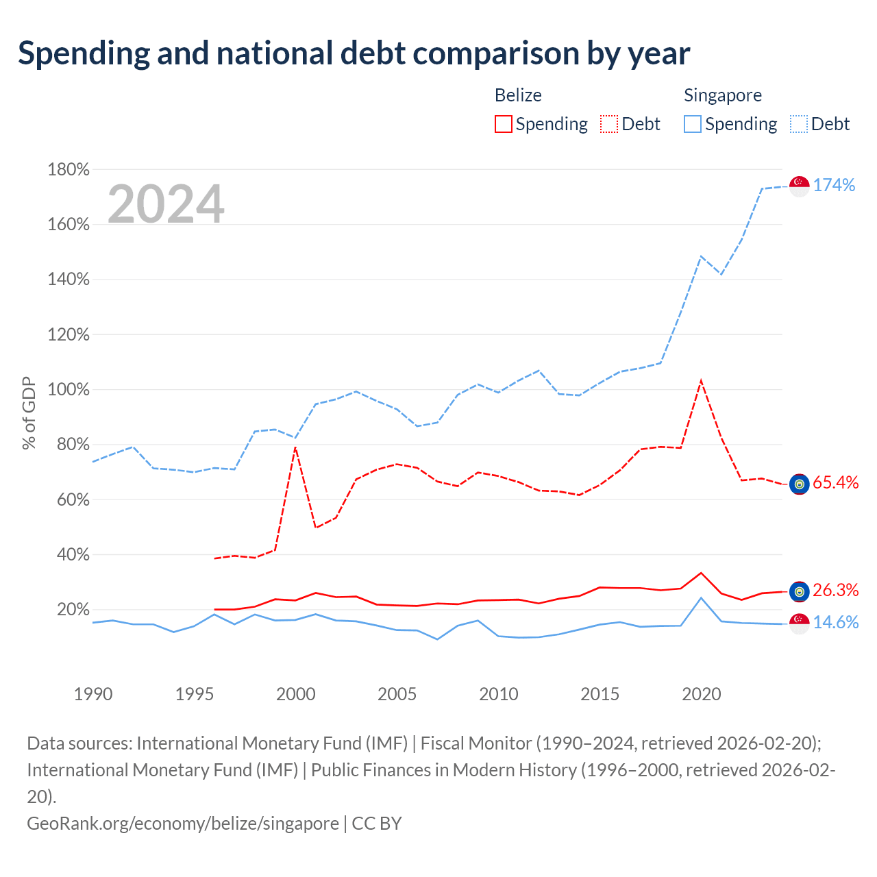 Belize has $2.1B in government debt (65.4% of GDP), compared to $950B (173.5% of GDP) in Singapore.