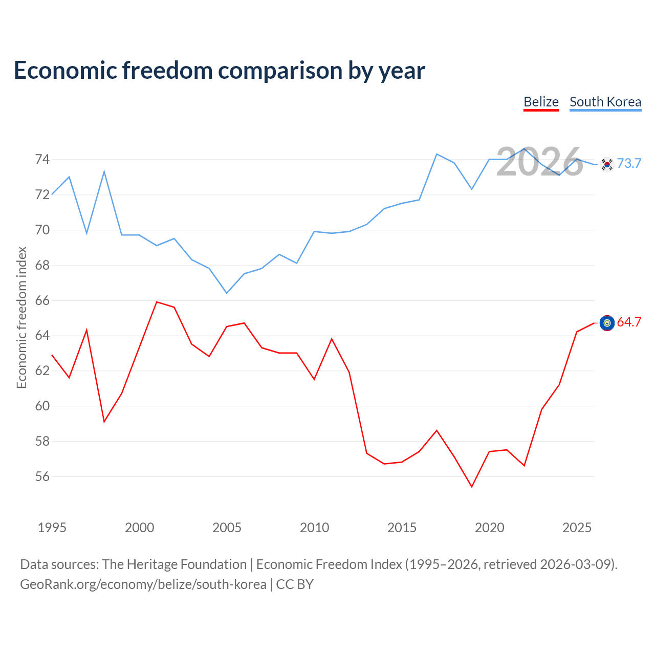 The Economic Freedom Index for Belize is 64.7, ranking 71/197, compared to 73.7 for South Korea, ranking 24/197. The chart above displays a comparison of annual changes in economic freedom indexes.