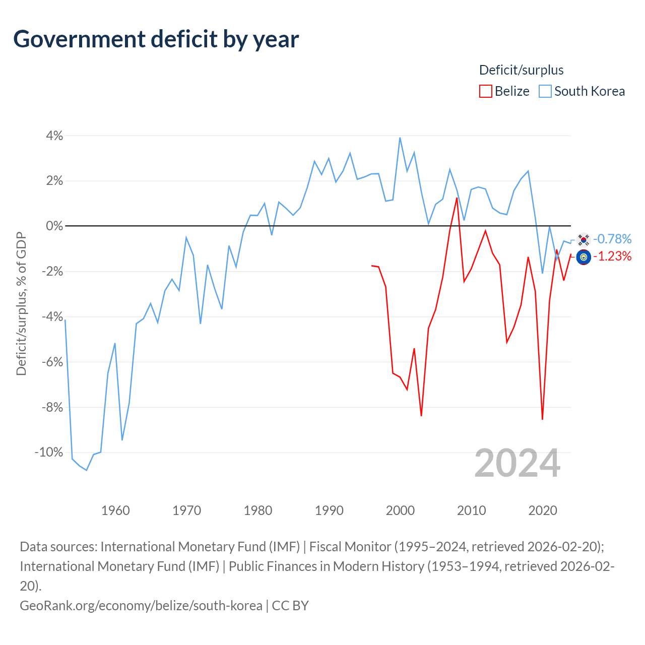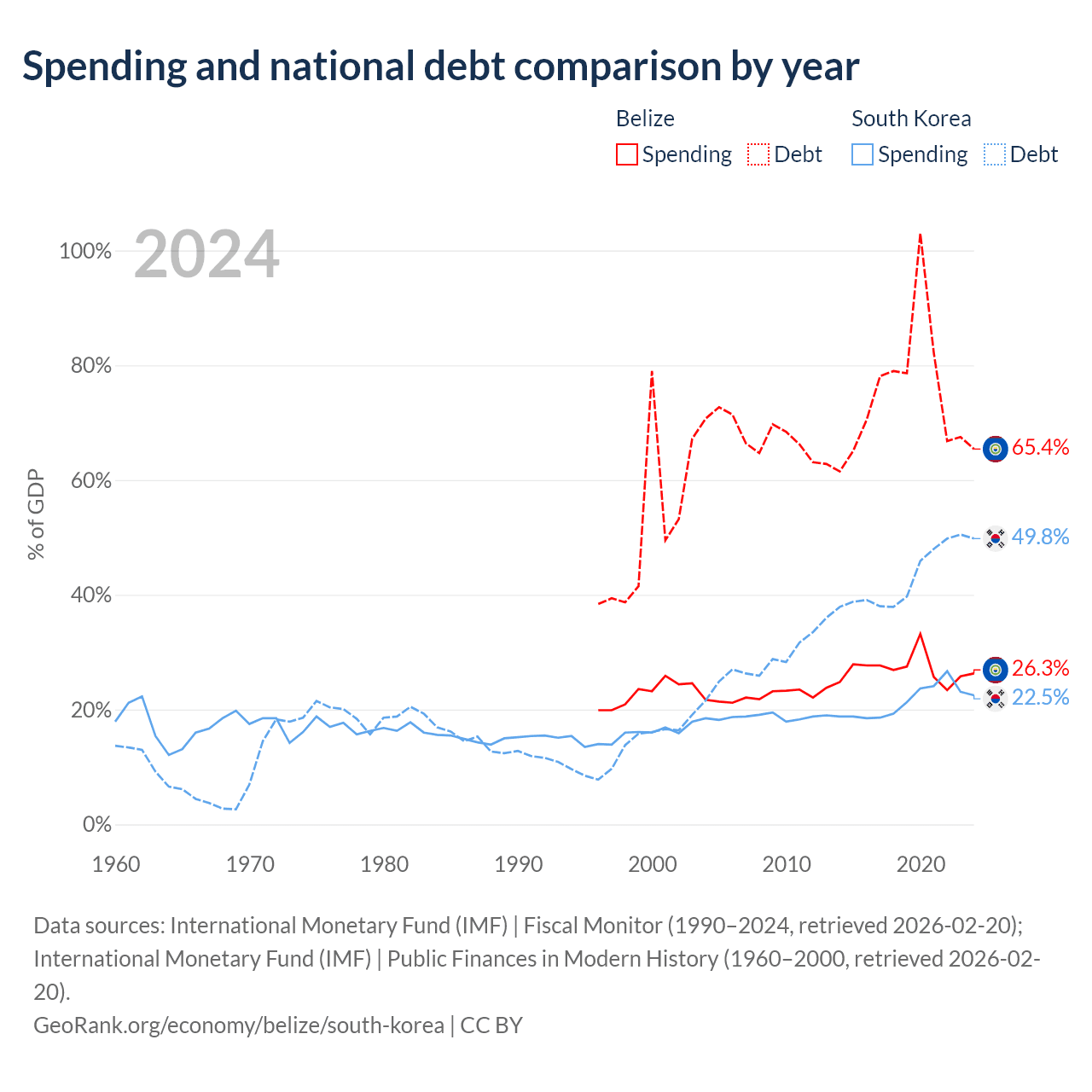 Belize has $2.1B in government debt (65.4% of GDP), compared to $934B (49.8% of GDP) in South Korea.