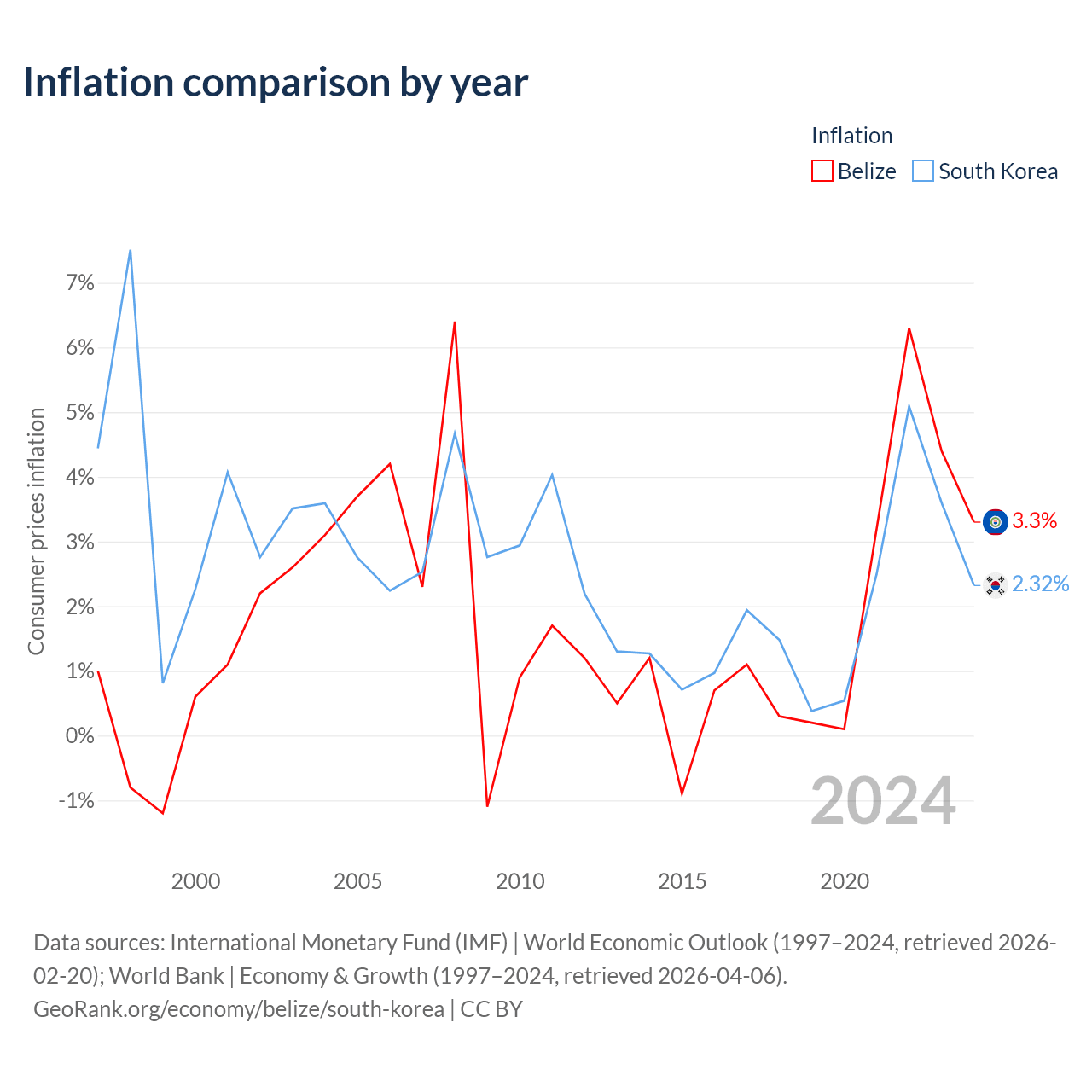 Belize has a GDP of $3.2B compared to $1.88T for South Korea, ranking 168/197 and 12/197 by economy size, respectively.