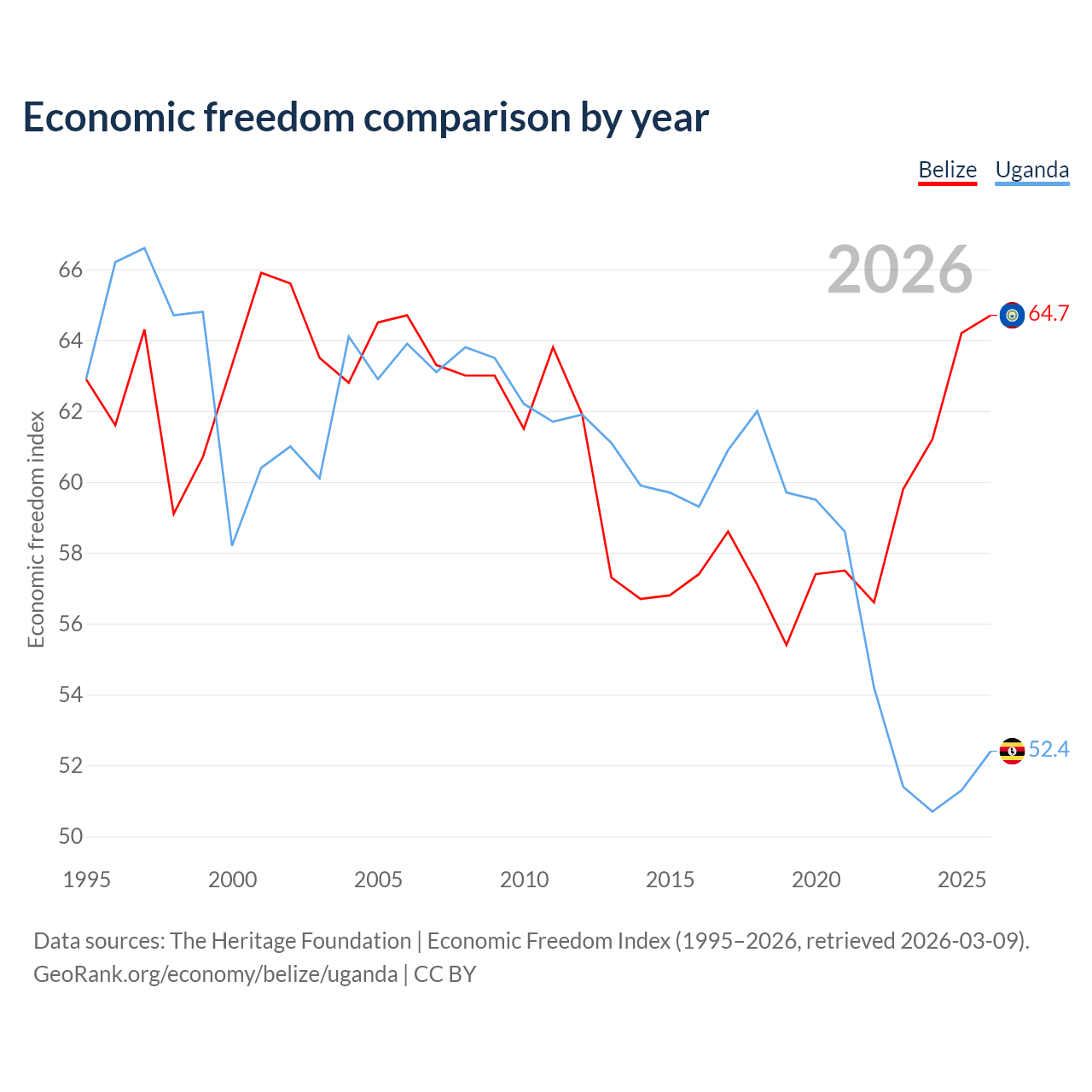 The Economic Freedom Index for Belize is 64.7, ranking 71/197, compared to 52.4 for Uganda, ranking 149/197. The chart above displays a comparison of annual changes in economic freedom indexes.