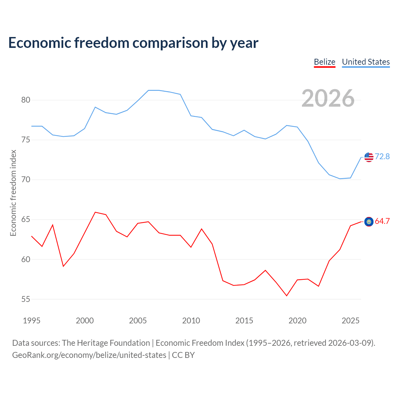 The Economic Freedom Index for Belize is 64.7, ranking 71/197, compared to 72.8 for the United States, ranking 27/197. The chart above displays a comparison of annual changes in economic freedom indexes.
