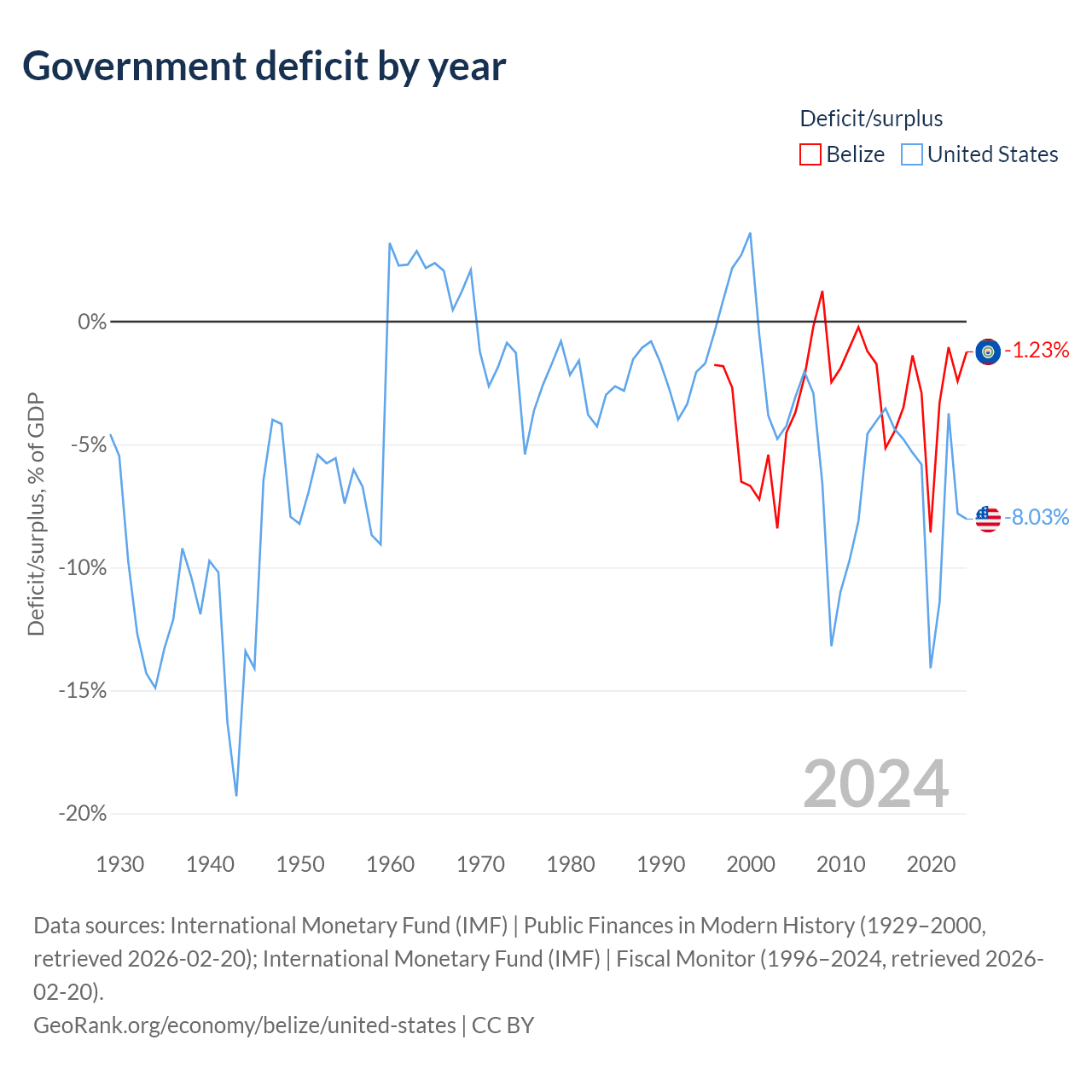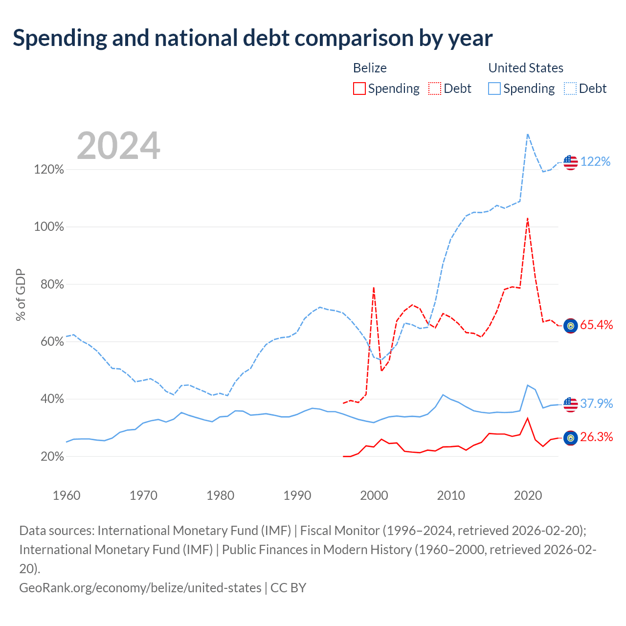 Belize has $2.1B in government debt (65.4% of GDP), compared to $35.2T (122.3% of GDP) in the United States.