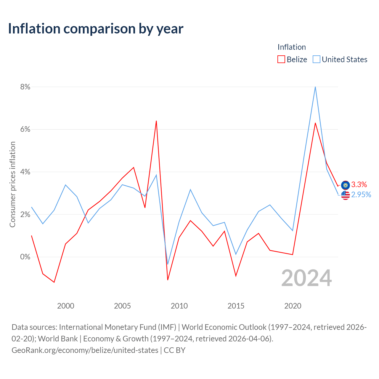 Belize has a GDP of $3.2B compared to $28.8T for the United States, ranking 168/197 and 1/197 by economy size, respectively.