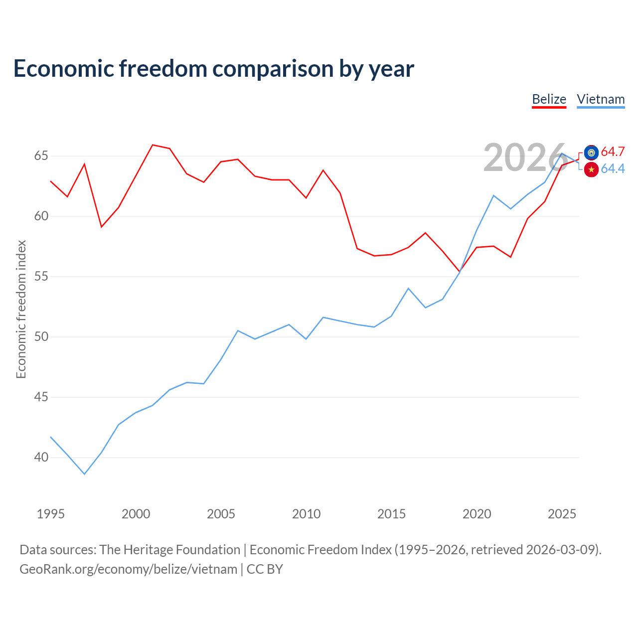 The Economic Freedom Index for Belize is 64.7, ranking 71/197, compared to 64.4 for Vietnam, ranking 73/197. The chart above displays a comparison of annual changes in economic freedom indexes.