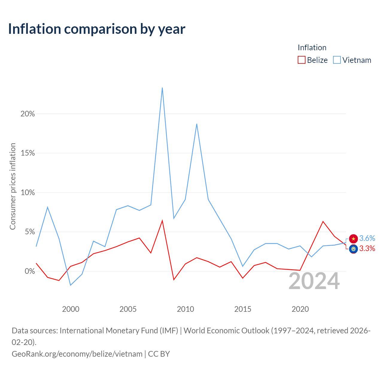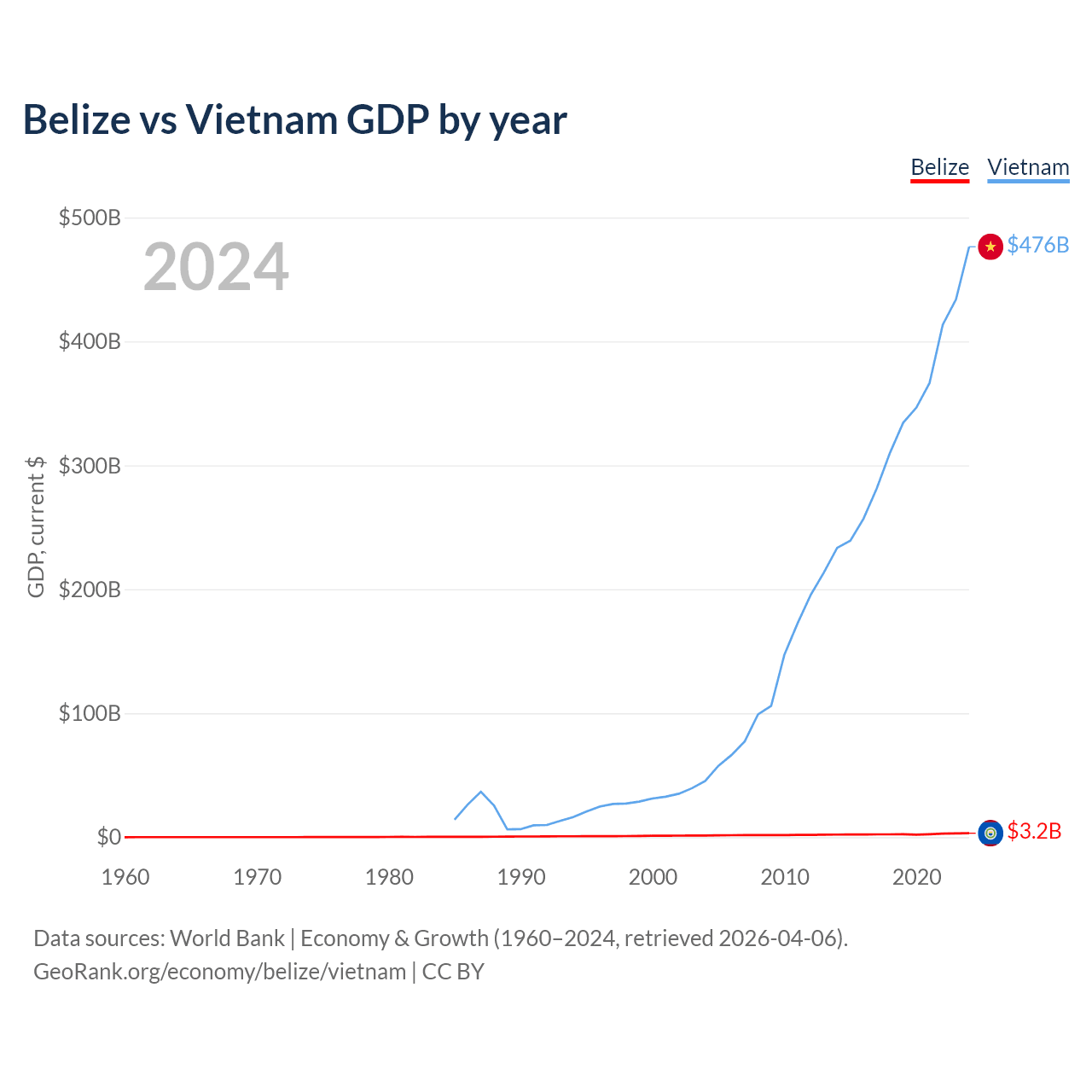 Belize has a GDP of $3.2B compared to $476B for Vietnam, ranking 168/197 and 33/197 by economy size, respectively.