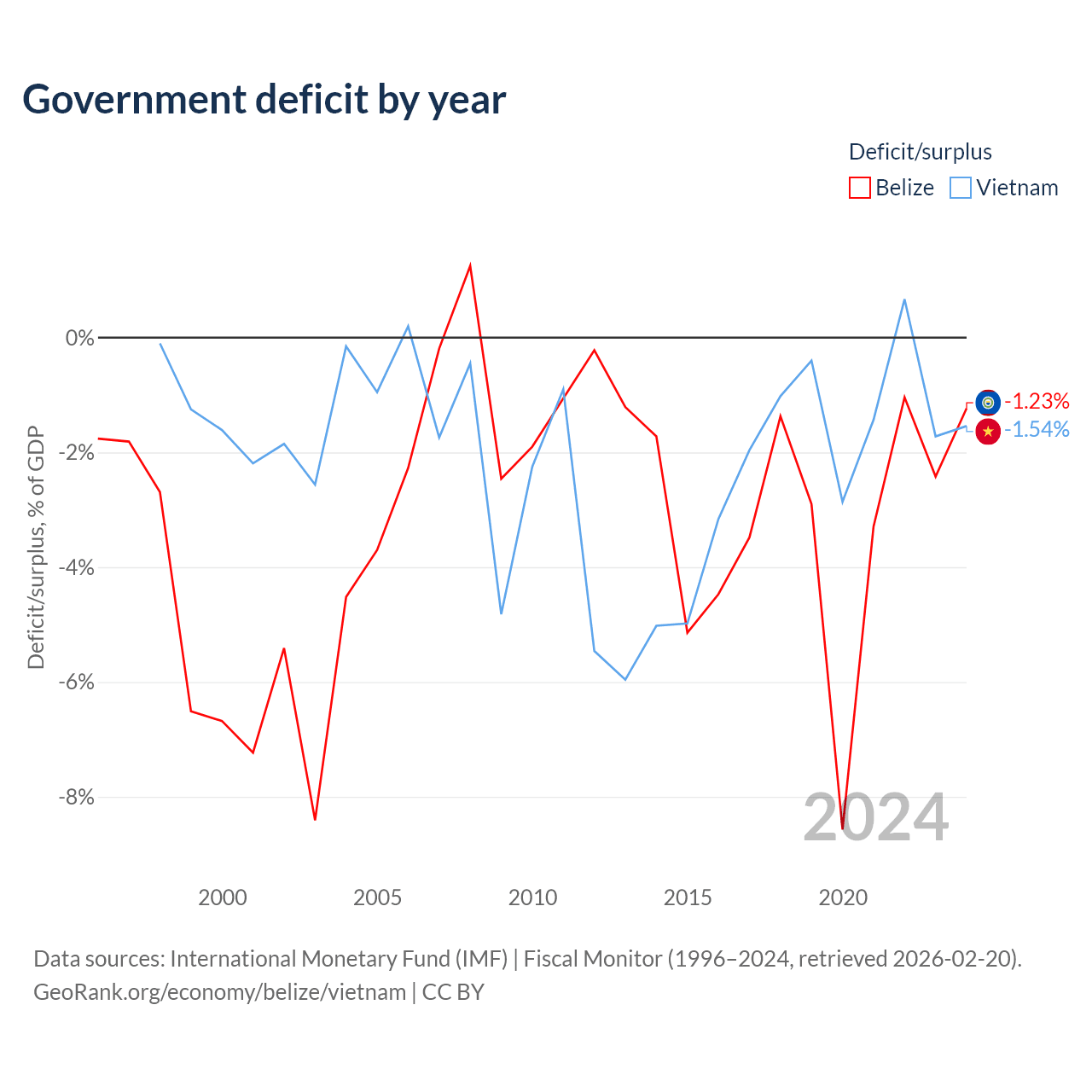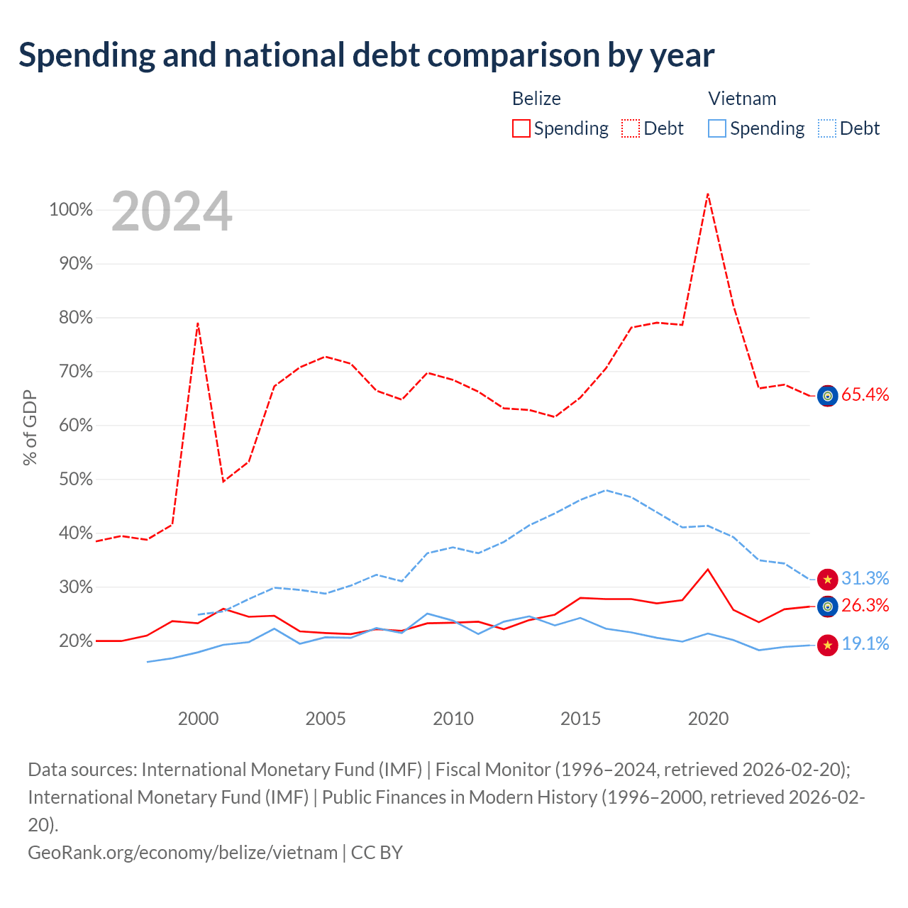 Belize has $2.1B in government debt (65.4% of GDP), compared to $149B (31.3% of GDP) in Vietnam.