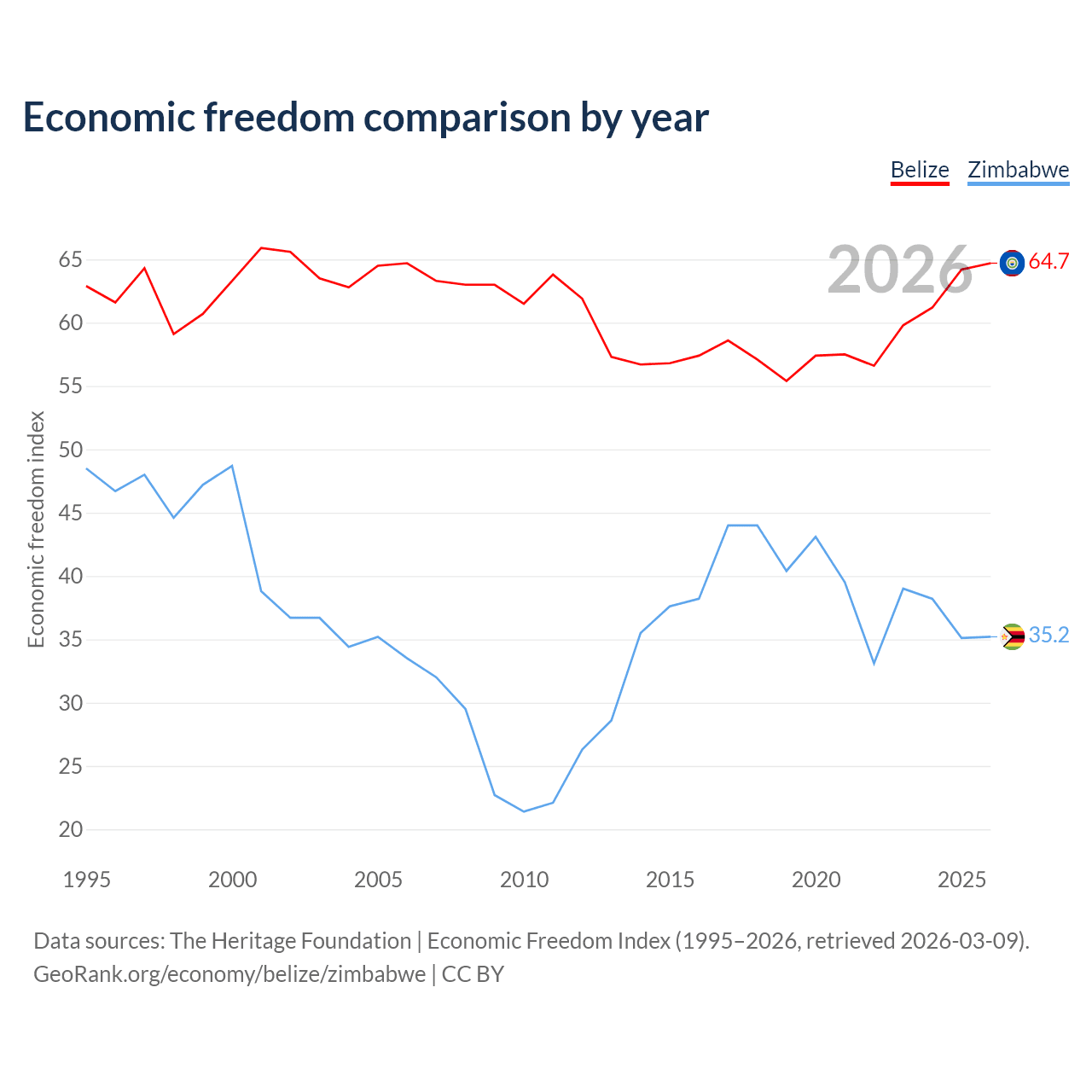 The Economic Freedom Index for Belize is 64.7, ranking 71/197, compared to 35.2 for Zimbabwe, ranking 190/197. The chart above displays a comparison of annual changes in economic freedom indexes.