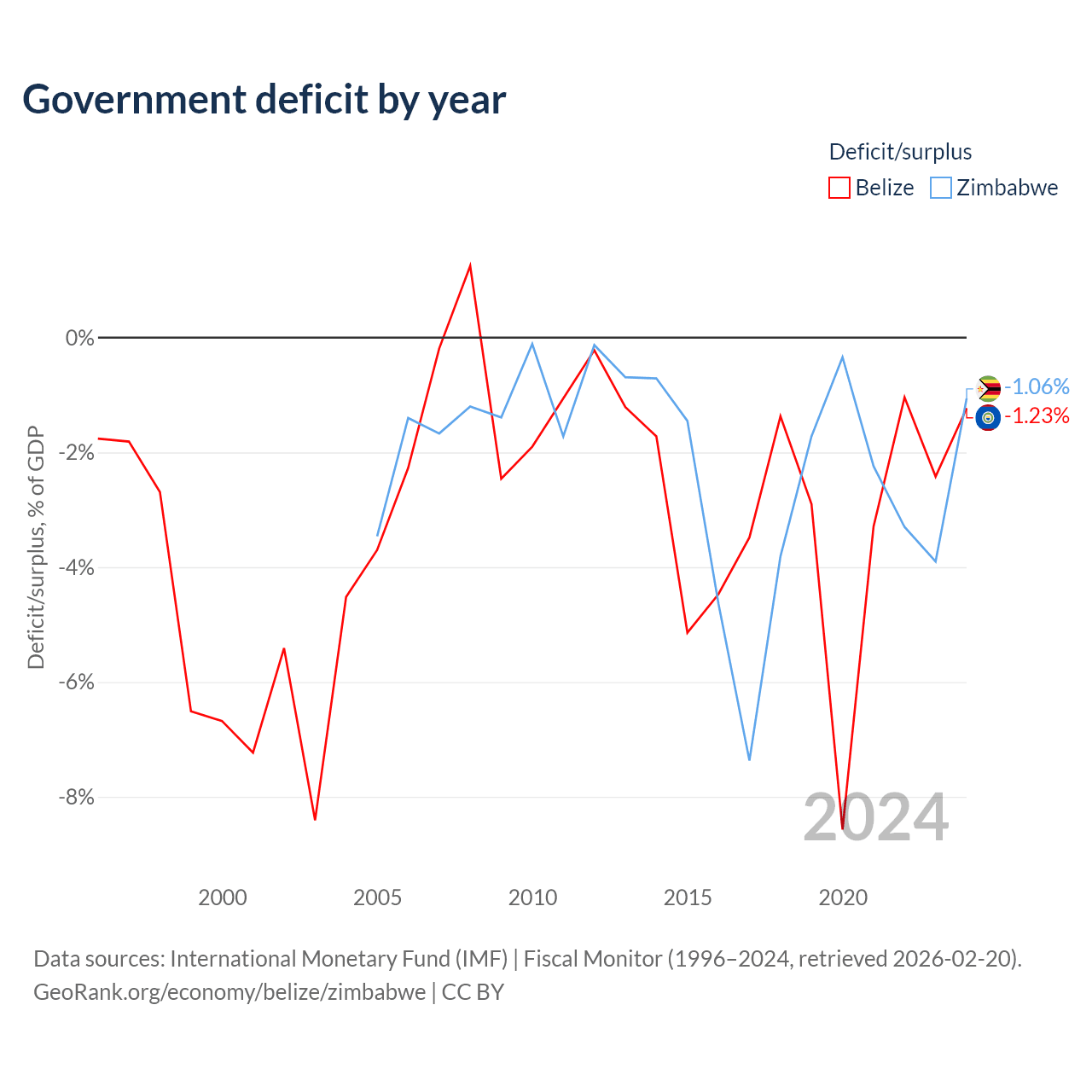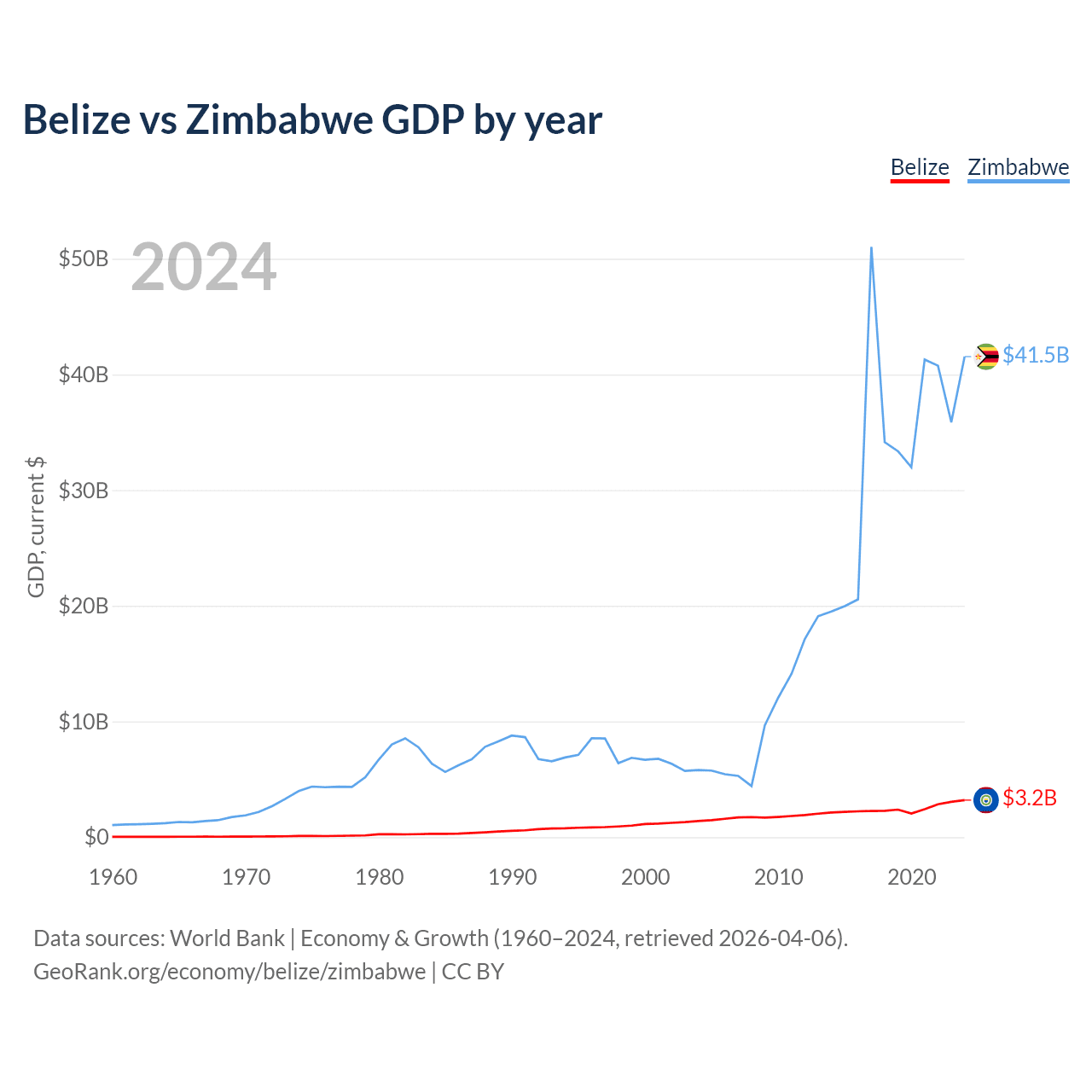 Belize has a GDP of $3.2B compared to $41.5B for Zimbabwe, ranking 168/197 and 102/197 by economy size, respectively.
