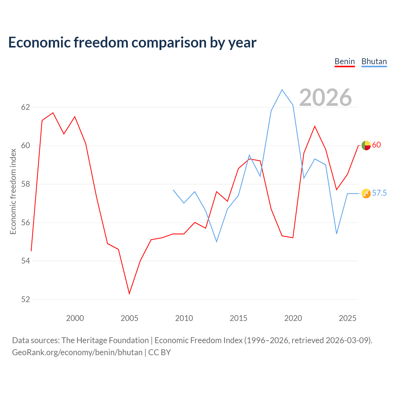 The Economic Freedom Index for Benin is 60, ranking 96/197, compared to 57.5 for Bhutan, ranking 115/197. The chart above displays a comparison of annual changes in economic freedom indexes.