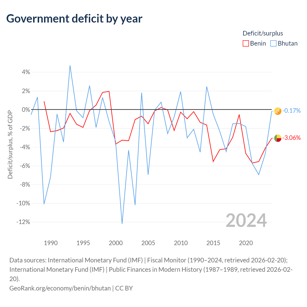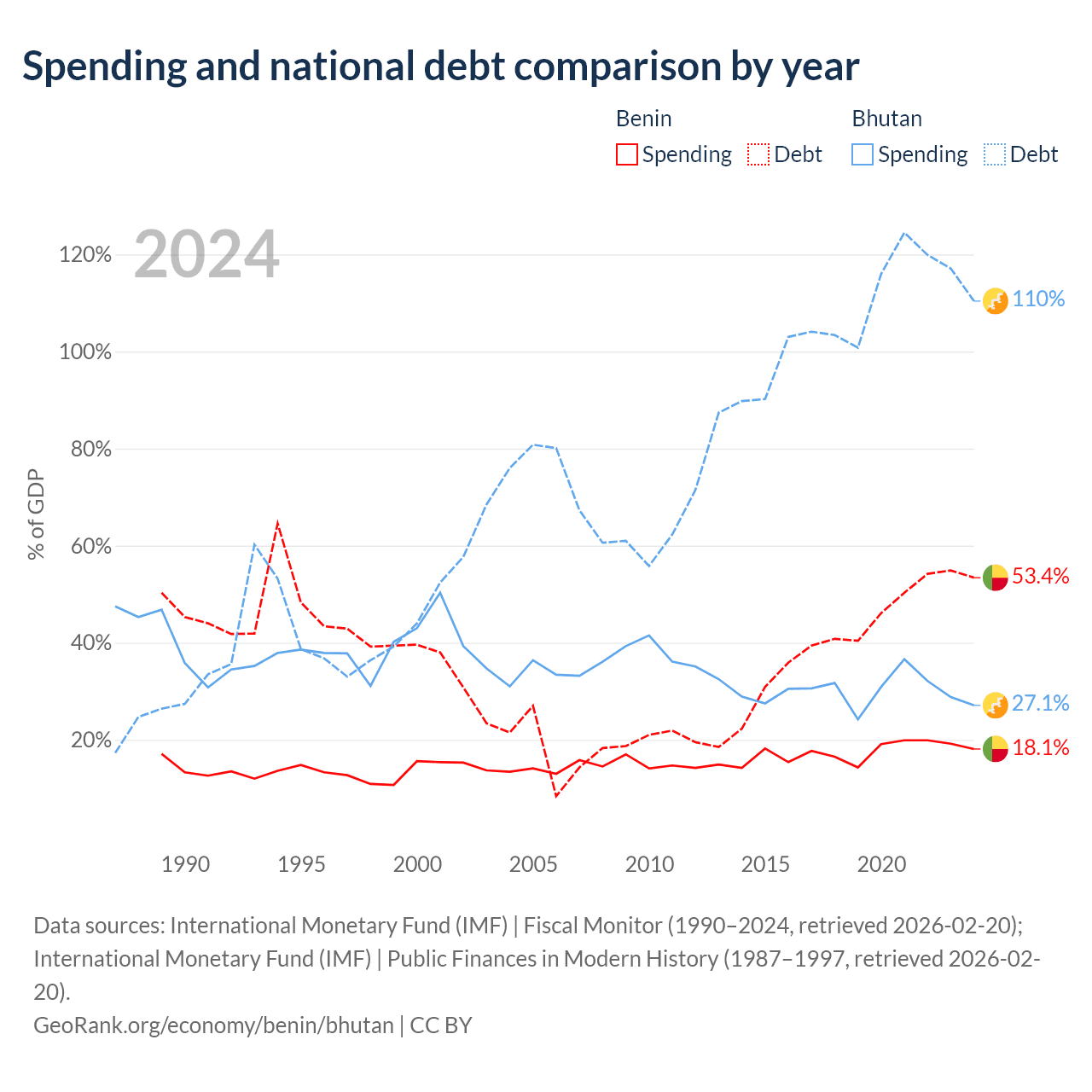 Benin has $11.5B in government debt (53.4% of GDP), compared to $3.53B (110.4% of GDP) in Bhutan.