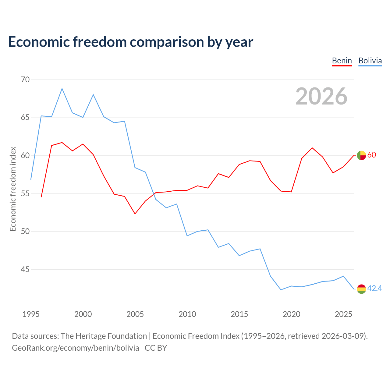 The Economic Freedom Index for Benin is 60, ranking 96/197, compared to 42.4 for Bolivia, ranking 184/197. The chart above displays a comparison of annual changes in economic freedom indexes.