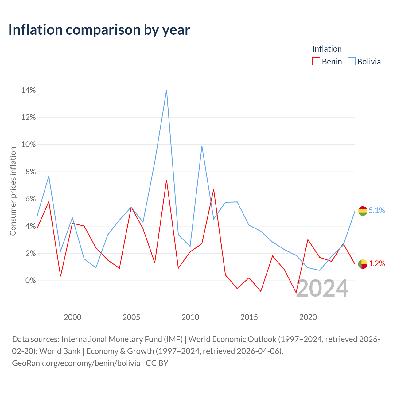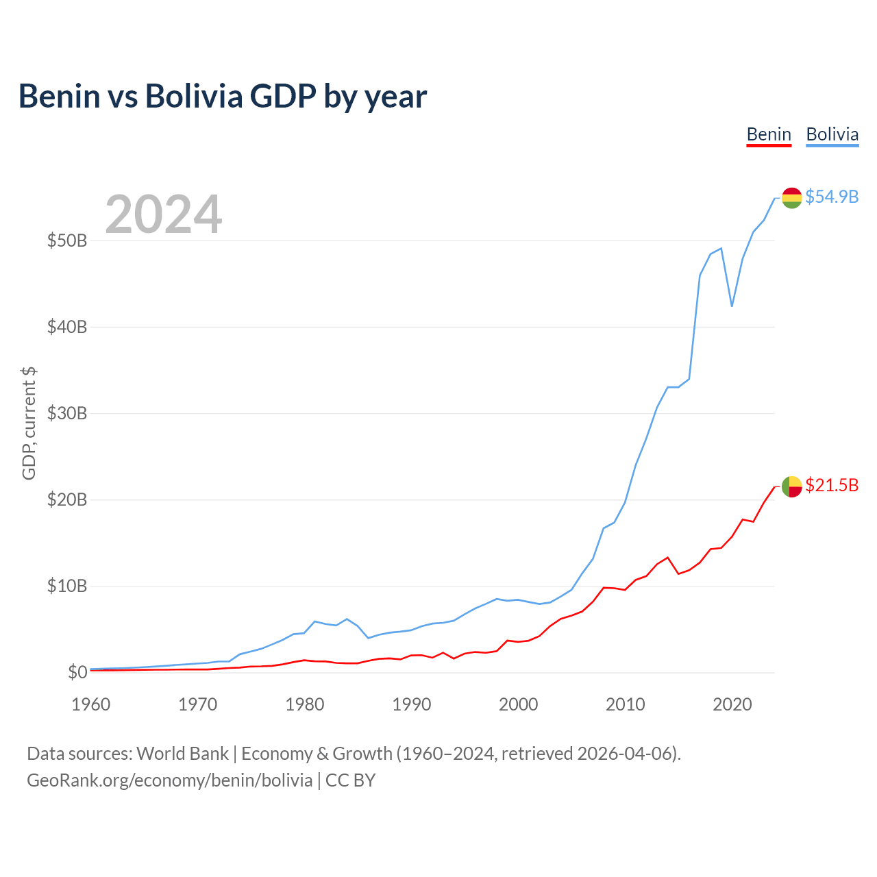 Benin has a GDP of $21.5B compared to $54.9B for Bolivia, ranking 126/197 and 88/197 by economy size, respectively.