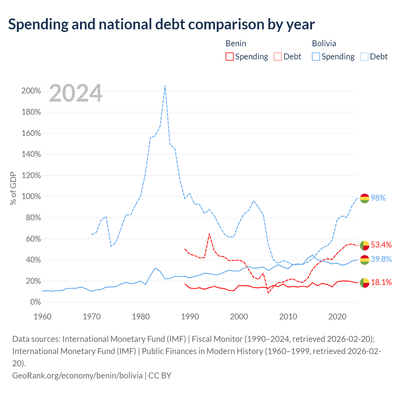 Benin has $11.5B in government debt (53.4% of GDP), compared to $53.8B (98% of GDP) in Bolivia.