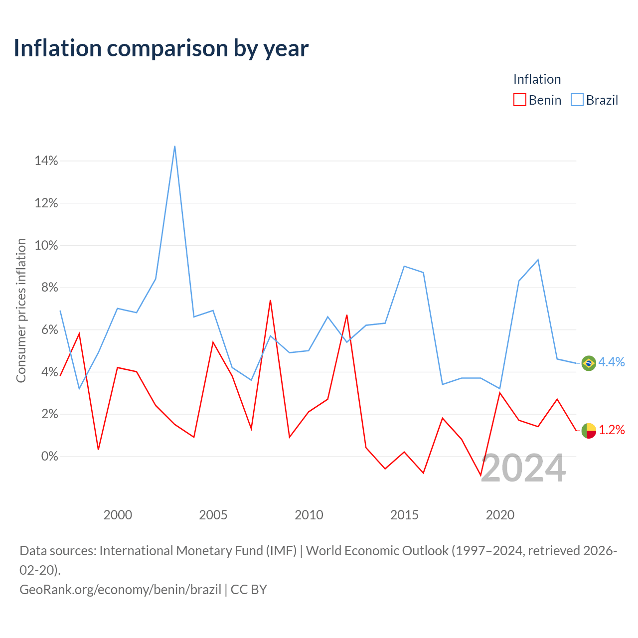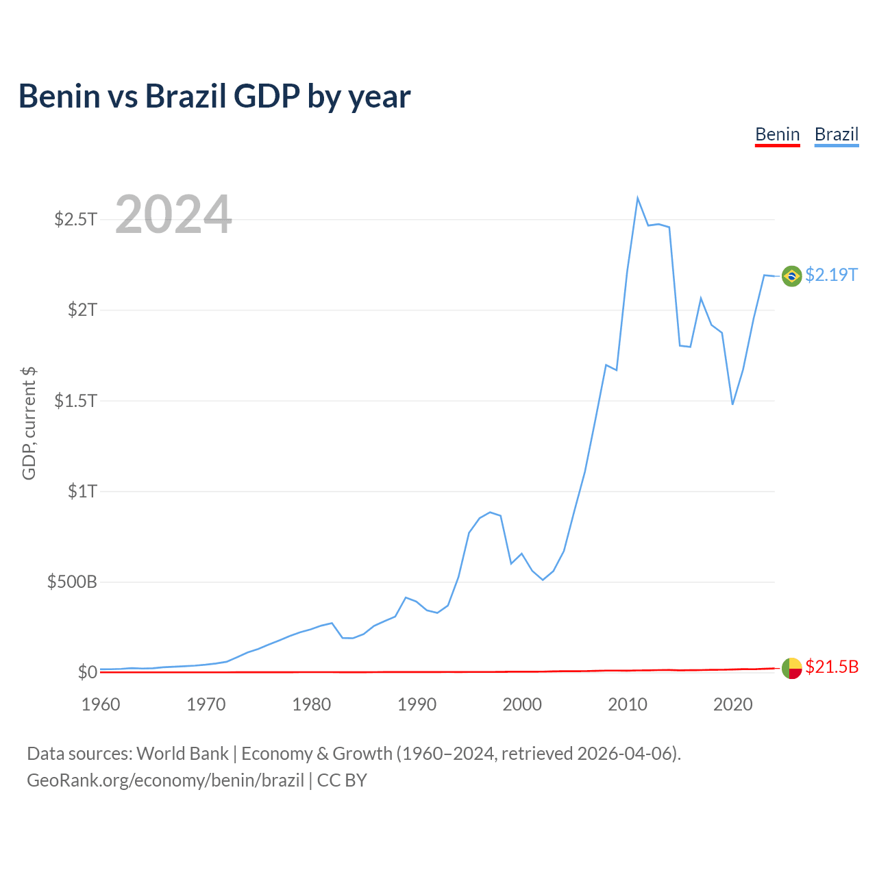 Benin has a GDP of $21.5B compared to $2.19T for Brazil, ranking 126/197 and 10/197 by economy size, respectively.