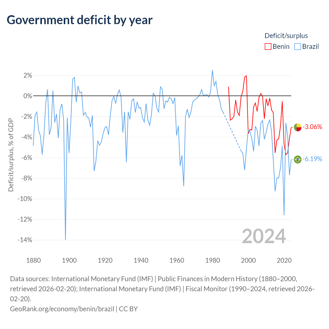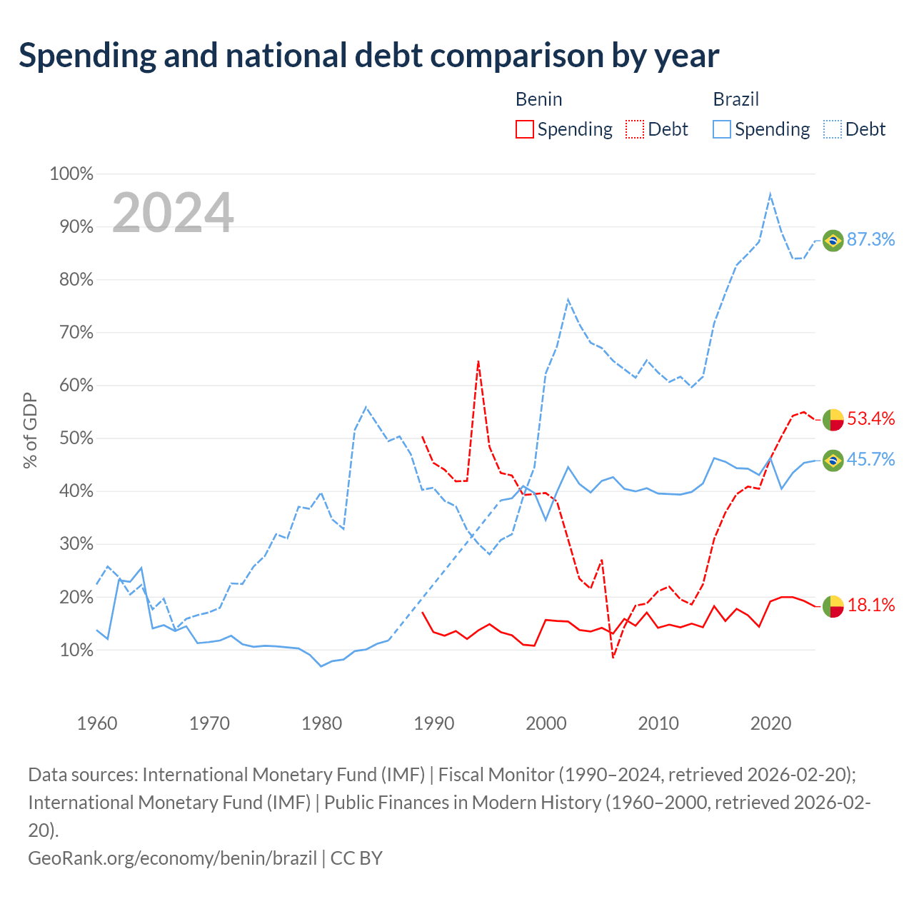 Benin has $11.5B in government debt (53.4% of GDP), compared to $1.91T (87.3% of GDP) in Brazil.