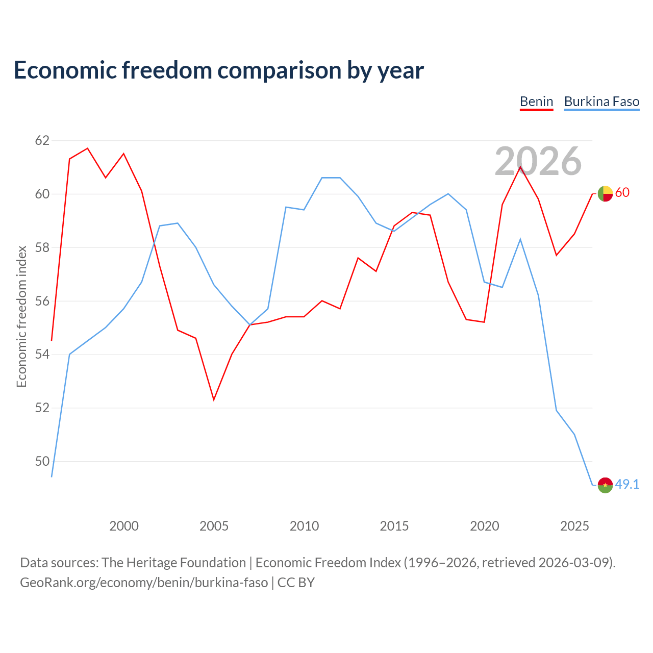 The Economic Freedom Index for Benin is 60, ranking 96/197, compared to 49.1 for Burkina Faso, ranking 167/197. The chart above displays a comparison of annual changes in economic freedom indexes.