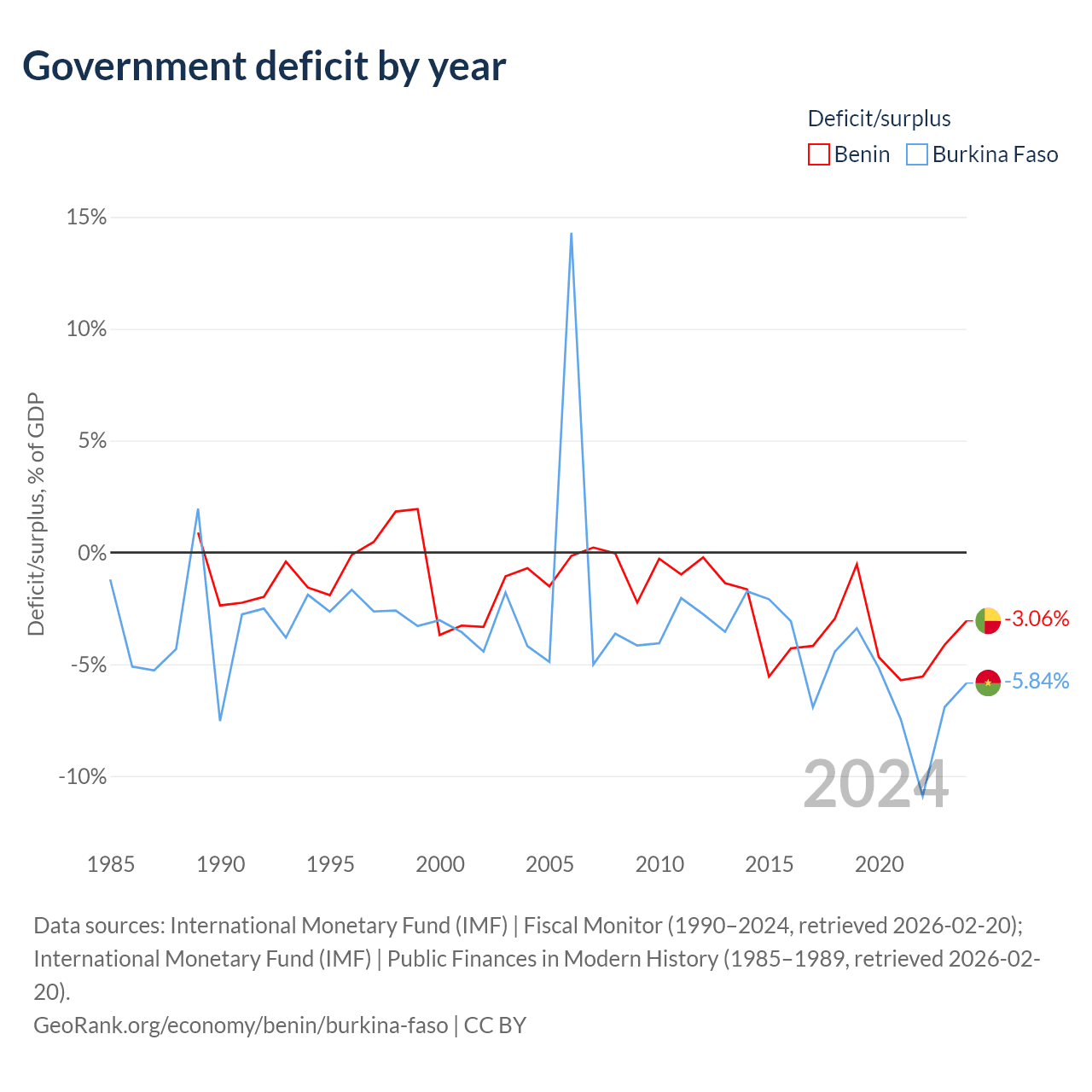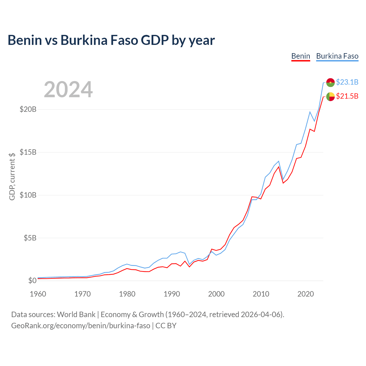 Benin has a GDP of $21.5B compared to $23.1B for Burkina Faso, ranking 126/197 and 122/197 by economy size, respectively.