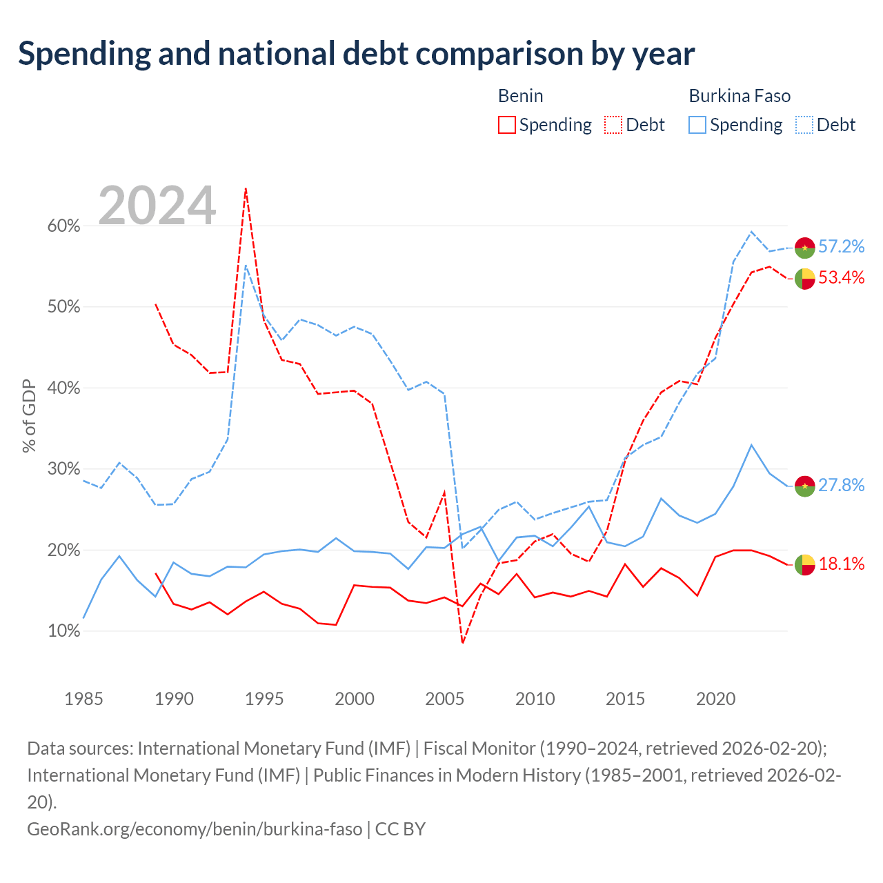 Benin has $11.5B in government debt (53.4% of GDP), compared to $13.2B (57.2% of GDP) in Burkina Faso.