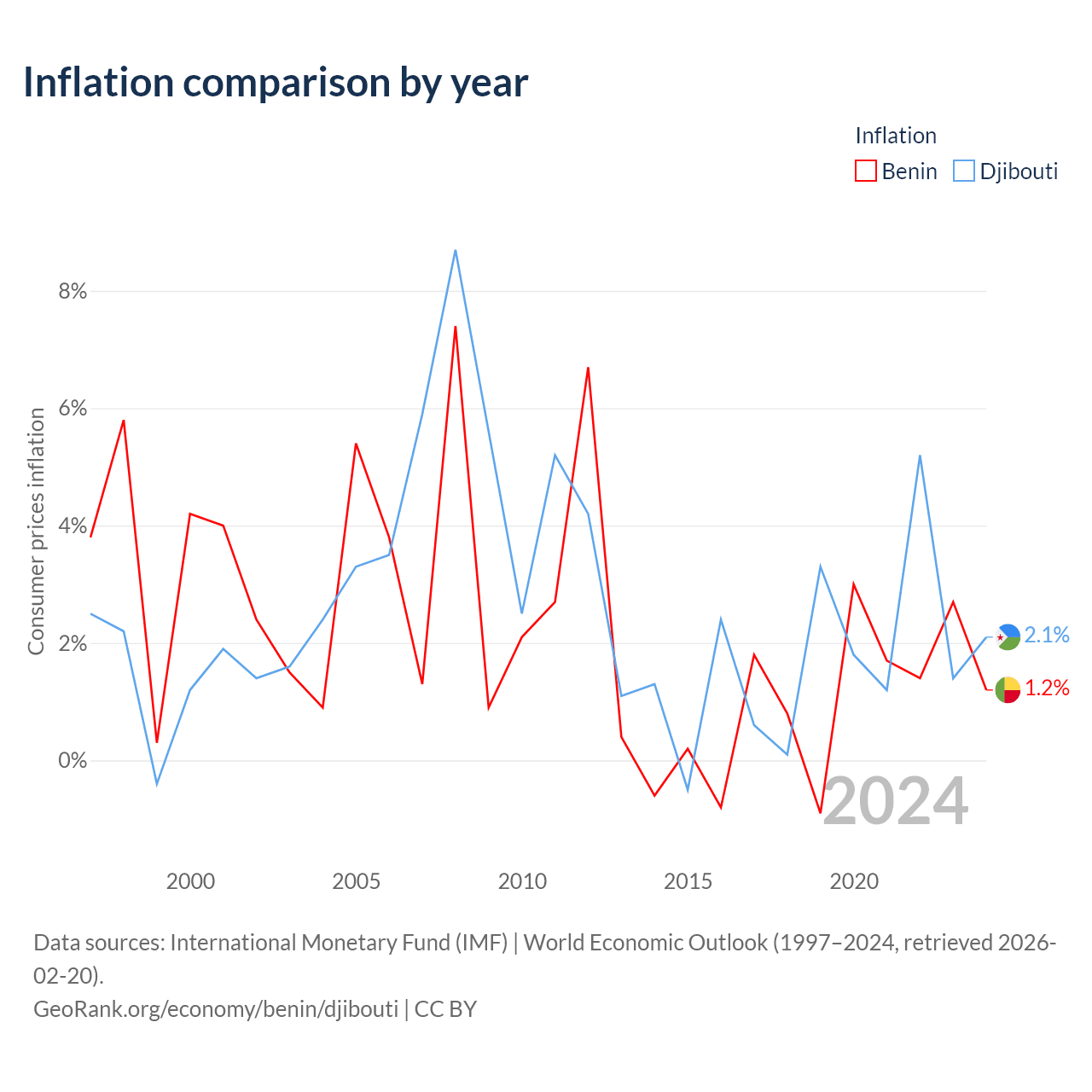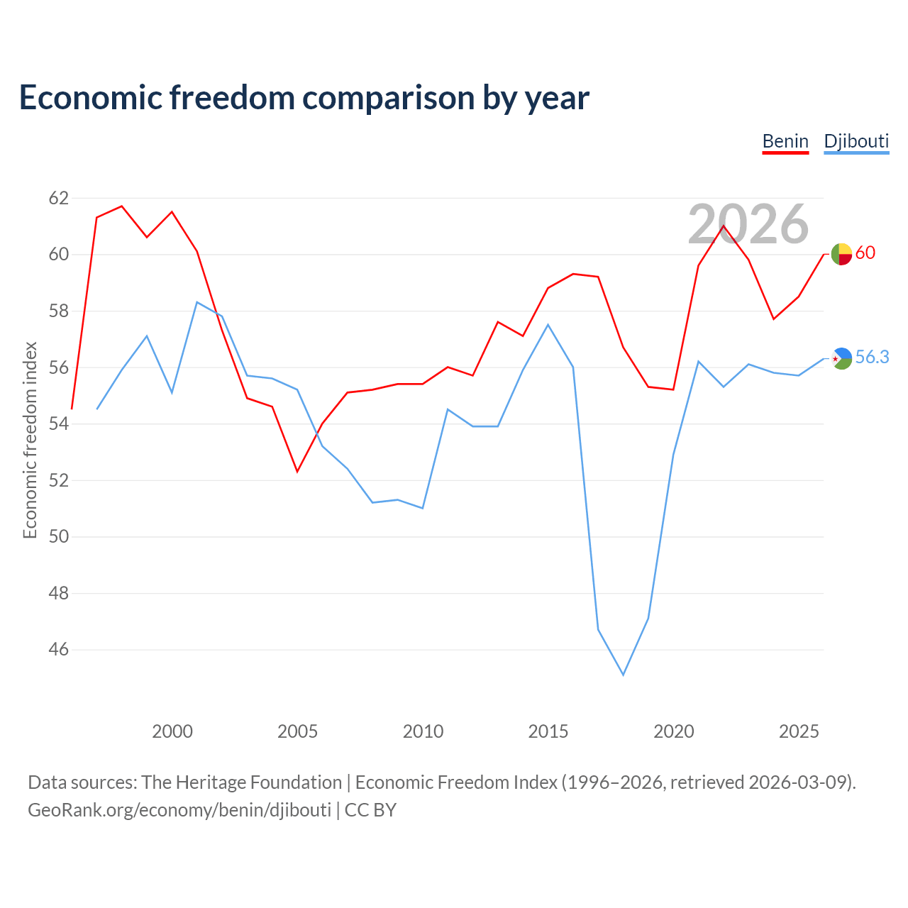 The Economic Freedom Index for Benin is 60, ranking 96/197, compared to 56.3 for Djibouti, ranking 122/197. The chart above displays a comparison of annual changes in economic freedom indexes.