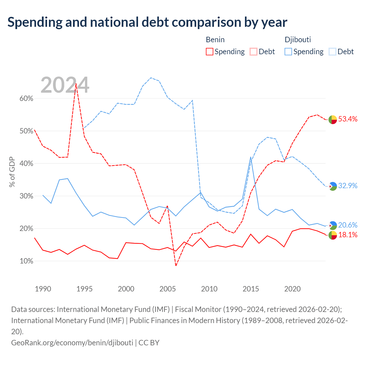 Benin has $11.5B in government debt (53.4% of GDP), compared to $1.36B (32.9% of GDP) in Djibouti.