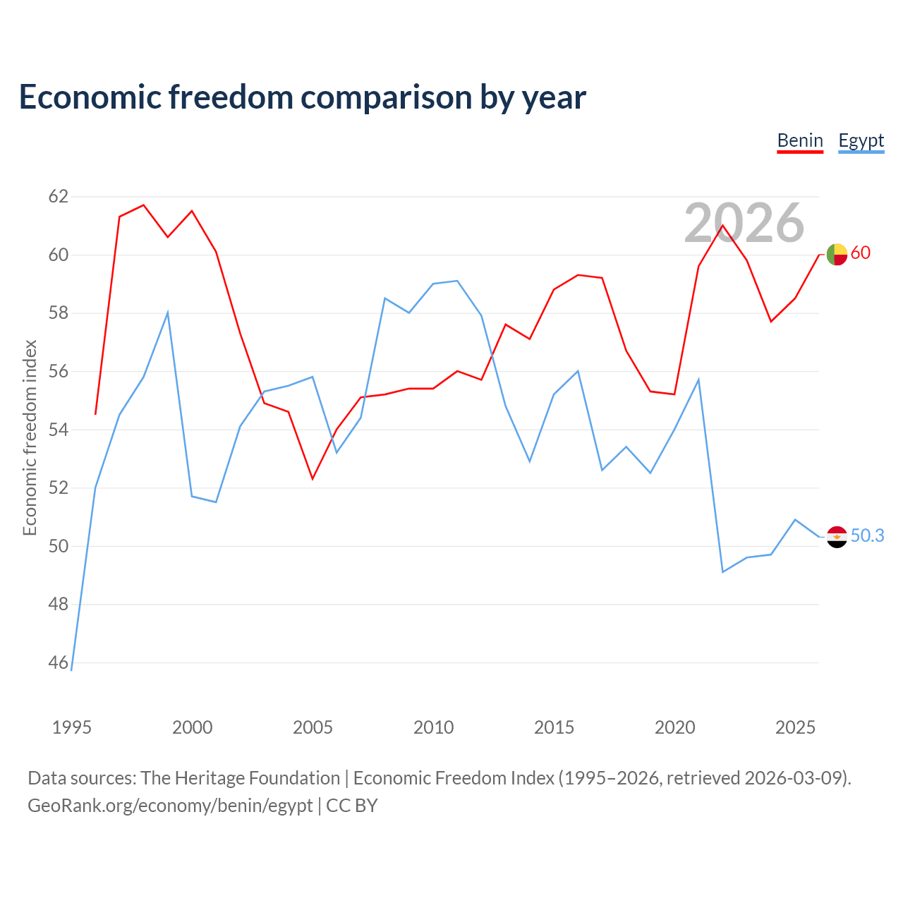 The Economic Freedom Index for Benin is 60, ranking 96/197, compared to 50.3 for Egypt, ranking 160/197. The chart above displays a comparison of annual changes in economic freedom indexes.