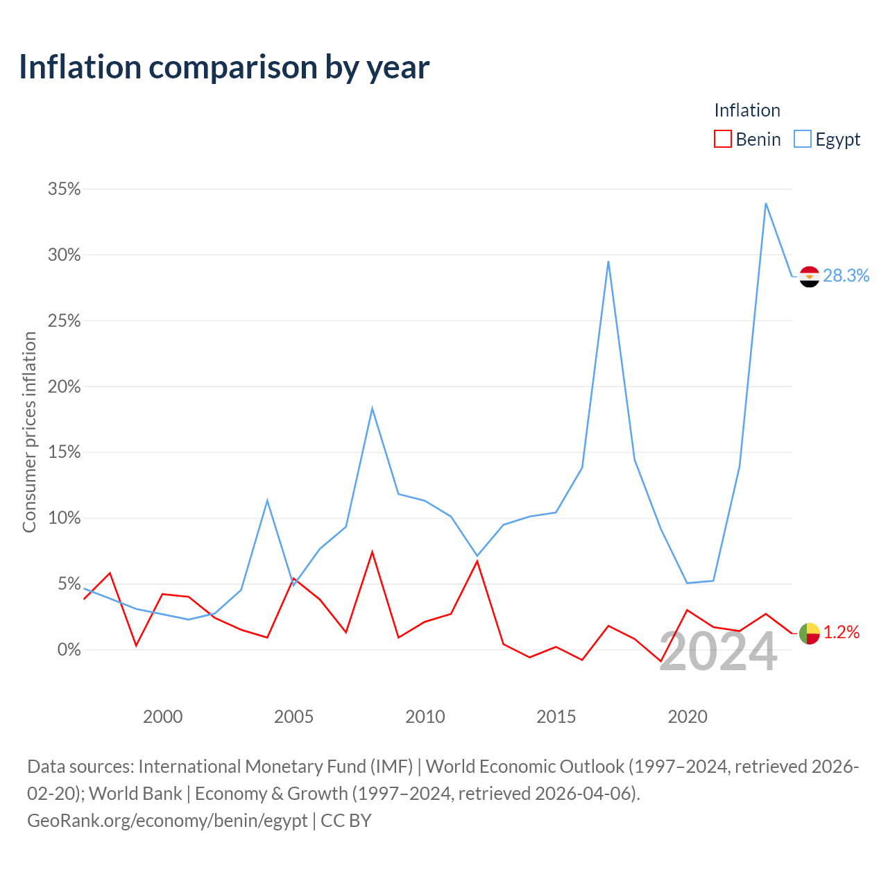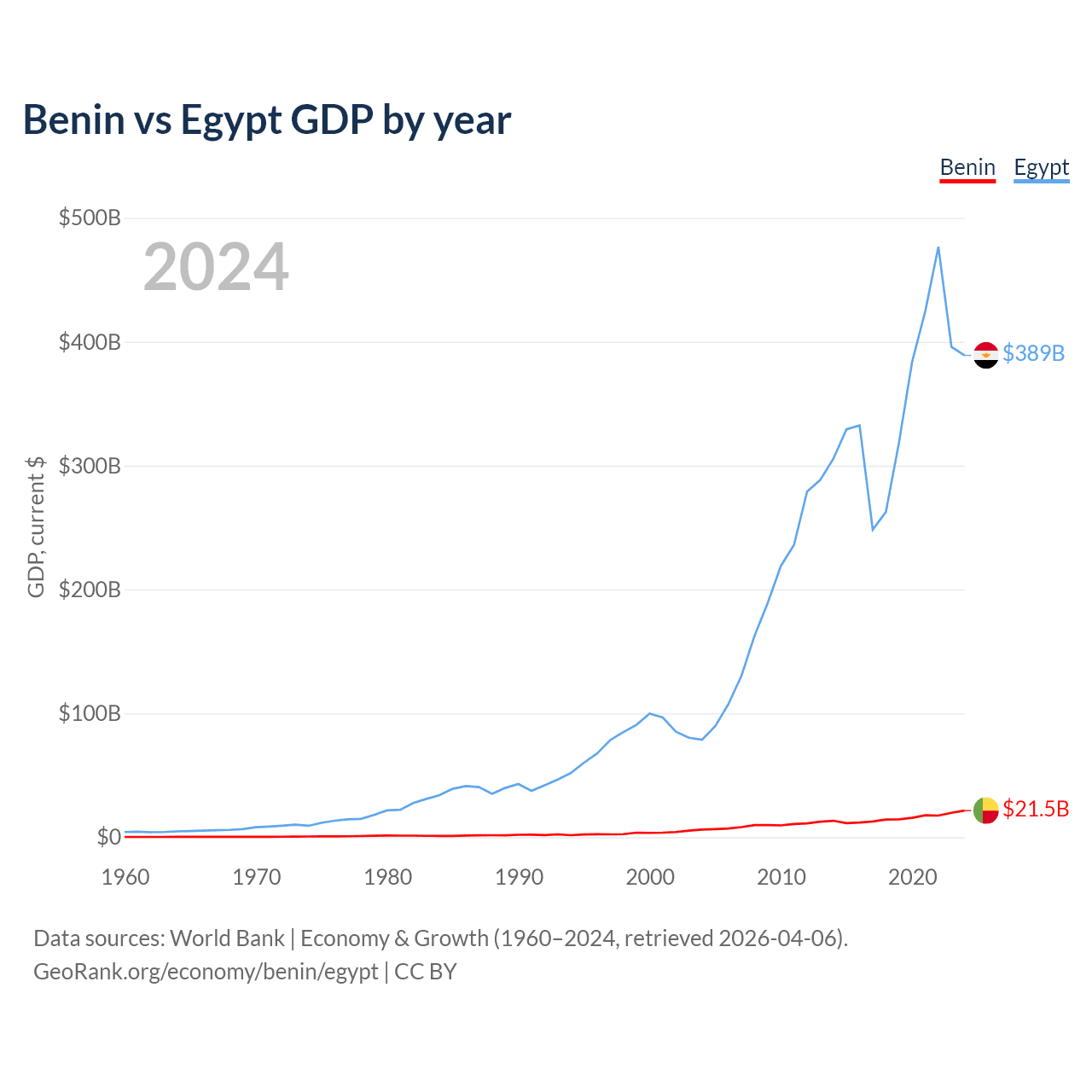 Benin has a GDP of $21.5B compared to $389B for Egypt, ranking 126/197 and 41/197 by economy size, respectively.